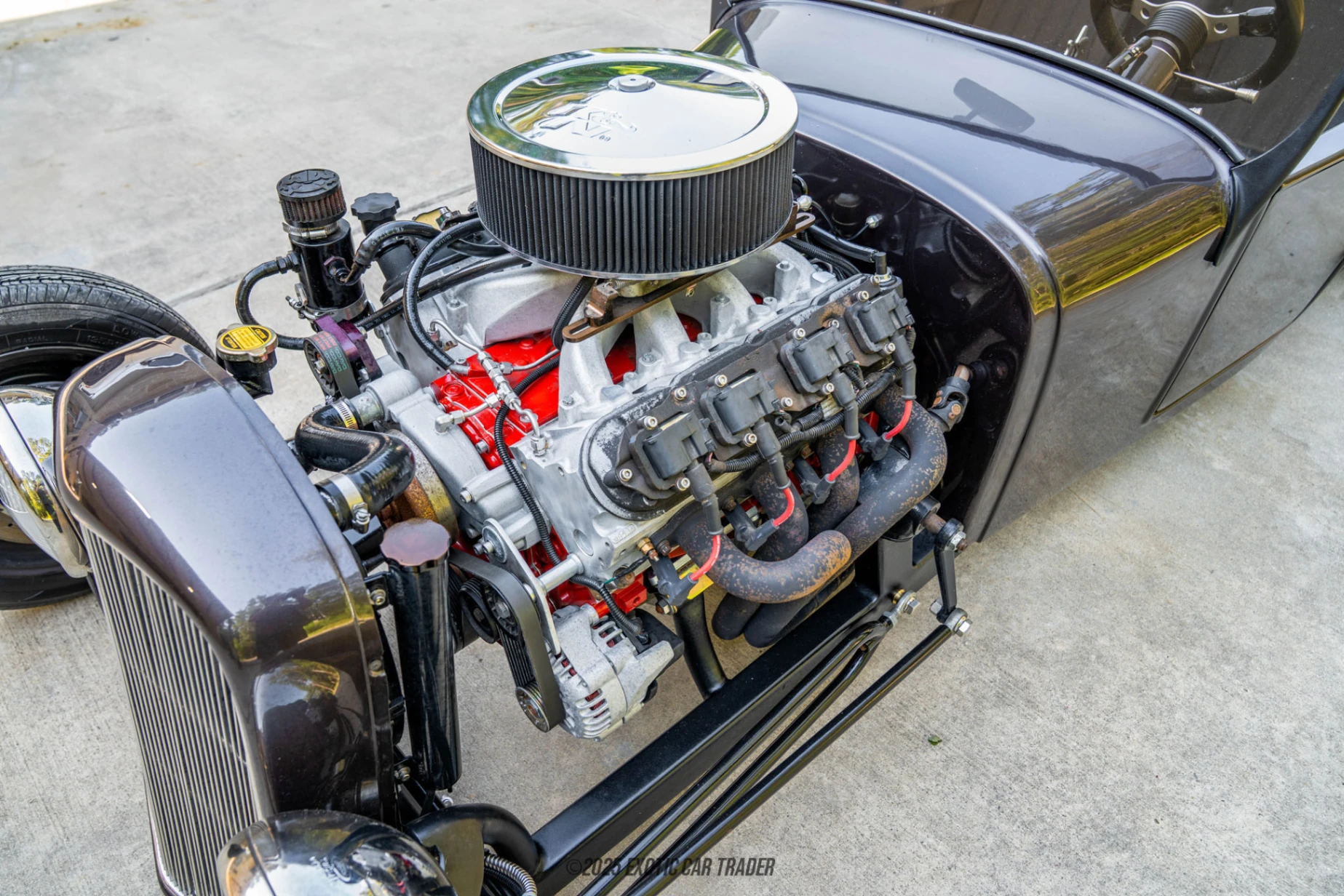 This 1927 Ford Hot Rod likely started life as a two-door or Tudor coupe, but it’s so far removed from that previous life that you’d be hard-pressed to see the similarities if you parked a period-correct example right next to it. This vehicle has been chopped, lowered, and rides on a set of black wheels with chrome hubcaps. The rear wheels, in particular, wear meaty tires that are definitely not just for show, but essential if the V8 up front is to gain any meaningful traction when you put your foot down. Other features include podded headlamps, a chrome radiator grille, exposed front suspension componentry, and, of course, an exposed engine bay. The passenger accommodations of this 1927 Ford Hot Rod consist of two low-back seats with black upholstery and lap belts. There’s a Dakota Digital gauge upgrade within the car’s dashboard, an aftermarket steering wheel, and the shifter for the car’s Powerglide transmission. There’s nothing else to distract you from the raw, visceral experience of driving this hot rod, but if you want to add, say, a radio, that’s entirely up to you.