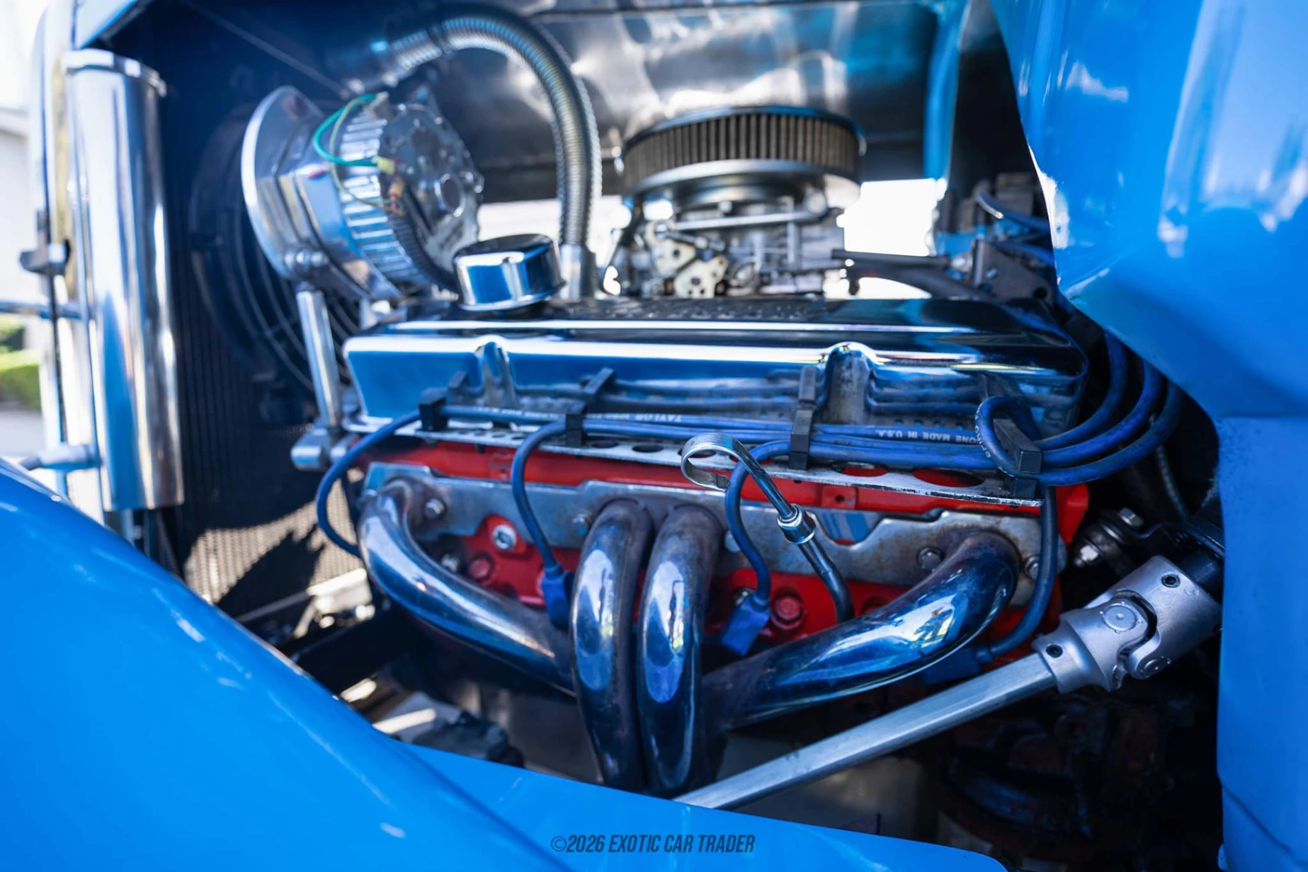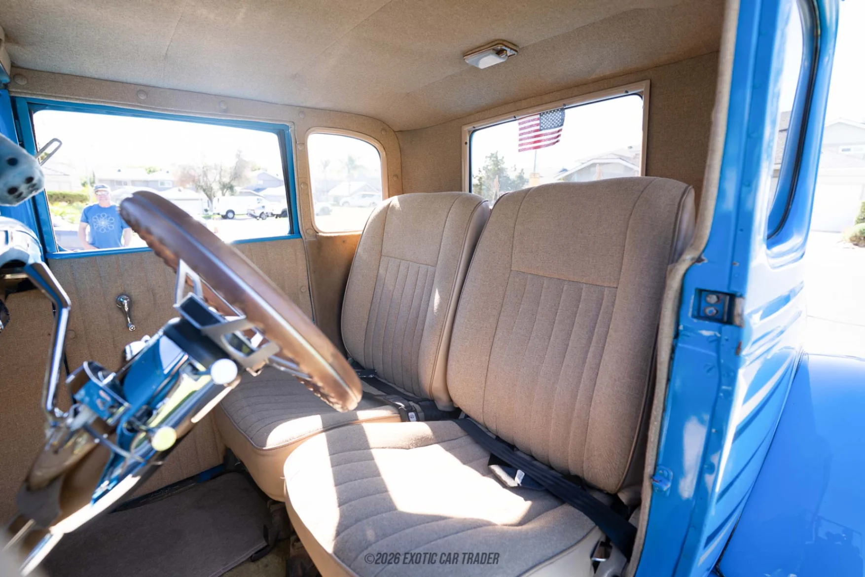 The exterior of this Ford Model A features a custom blue paint finish that catches the eye and highlights the car’s classic lines. Inside, the coupe presents a unique beige interior complemented by bucket seats, creating a vintage yet comfortable atmosphere. The front windshield's ability to pop out adds a charming touch, enhancing the experience of cruising in this iconic vehicle. This Model A is equipped with both style and practicality, making it an ideal choice for both shows and leisurely drives.