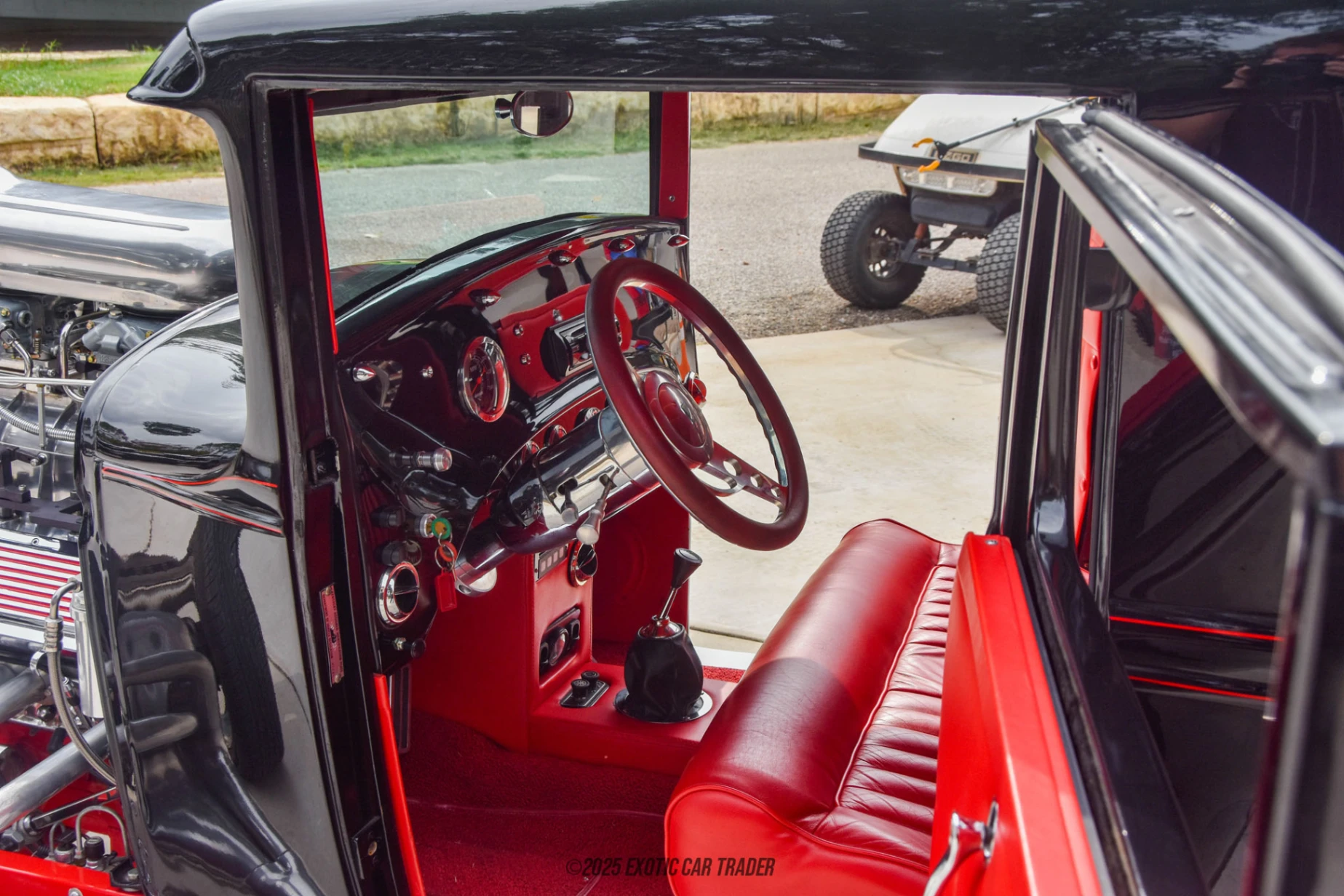 Power is supplied by a 383ci V8 stroker topped with The Blower Shop 6-71 Teflon Rotor Supercharger and twin 4-barrel Holley 850 blower carburetors, delivering a dyno-verified 903 horsepower. The combination feeds through a 4L80E computerized automatic transmission equipped with a 2800-stall converter and overdrive lockout, supporting both street drivability and high-load applications. A narrowed Ford 9” rear end with a 3.70 Posi gear ratio channels power to the pavement, while RideTech air rear suspension, a polished dropped front axle, and side-exit headers contribute to the car’s dramatic appearance and performance capability. Vintage heat and air conditioning add comfort without compromising the traditional hot-rod character, rounding out a mechanical package built for presence, power, and usability.
