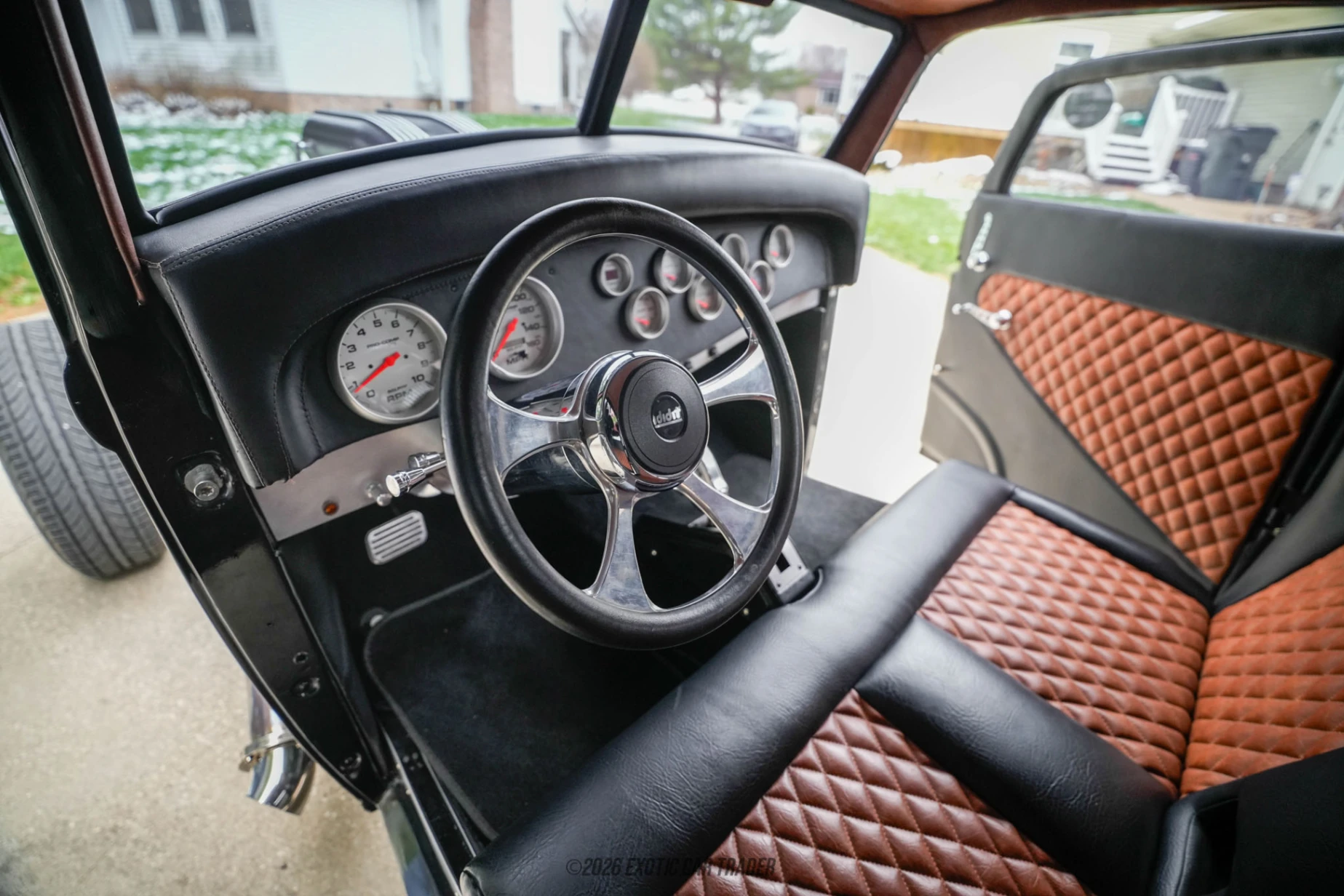 Finished in black, the exterior of this 1932 Chrysler Series CI 3-Window Coupe showcases a clean yet aggressive look with its lowered roofline, removed fenders, and exposed Budnik forged wheels wrapped in meaty tires. Chrome accents, including the mirrors, add contrast, while a canvas sunroof introduces a unique custom touch to the roof. Inside, the cabin follows a cohesive black and brown two-tone theme with custom upholstery throughout the seats and door panels. The dashboard is fitted with white-faced AutoMeter gauges, complemented by an Ididit steering column and a B&M shifter, while the trunk has been reconfigured to house a relocated fuel tank, highlighting the depth of the build.