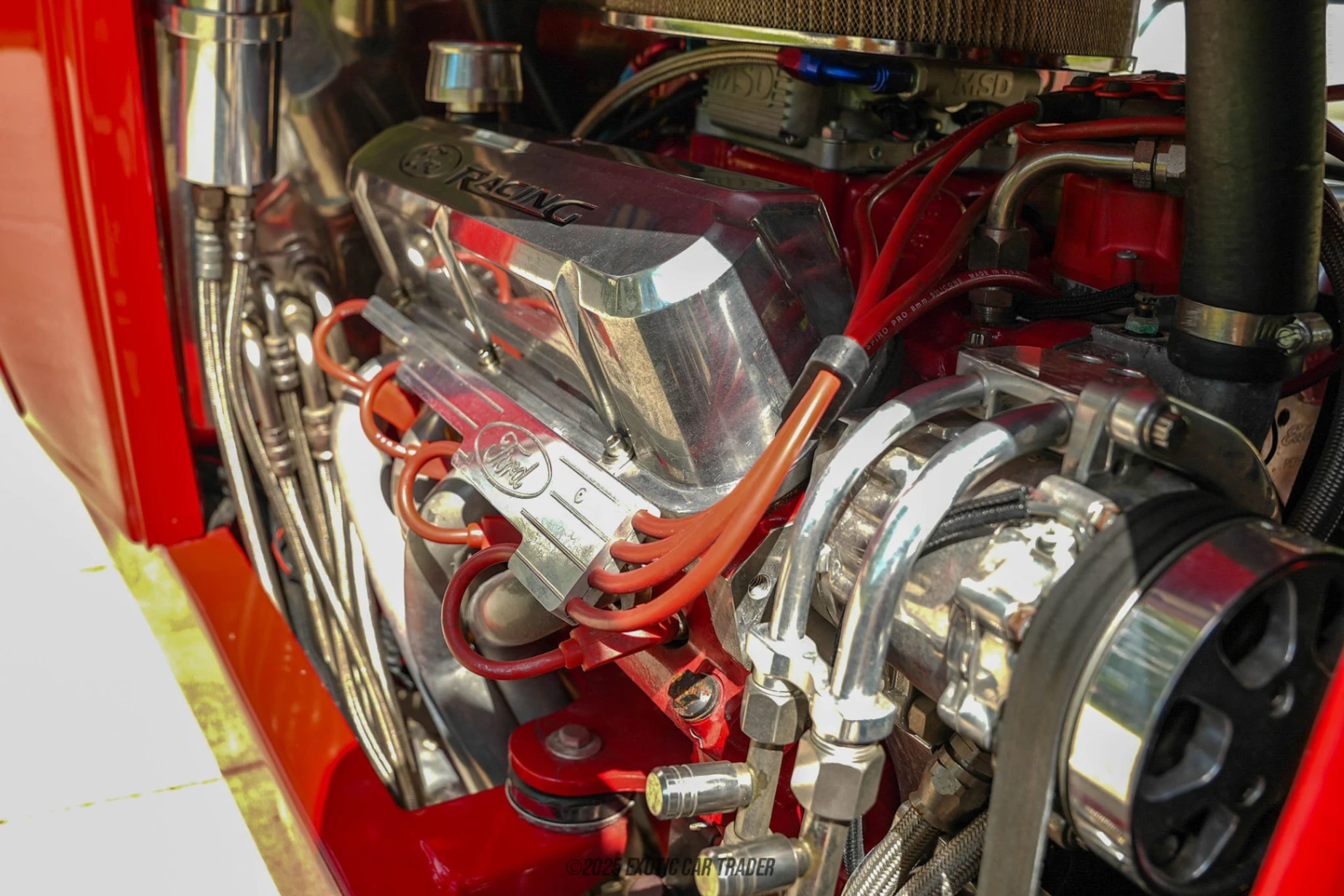 Powering this hot rod is a Ford Racing 351ci V8—a naturally aspirated small-block that blends classic Ford performance with modern upgrades. Dressed in polished aluminum valve covers and fed by an MSD ignition system, the engine delivers an estimated 275–300 horsepower through a C4 3-speed automatic transmission. A Ford 9-inch rear differential, dual exhaust with chrome tips, and adjustable coilovers ensure a balance of power and control. With its braided stainless lines, aluminum radiator, and meticulous detailing, this engine bay exemplifies show-quality presentation matched with reliable performance—a true testament to a build done right.