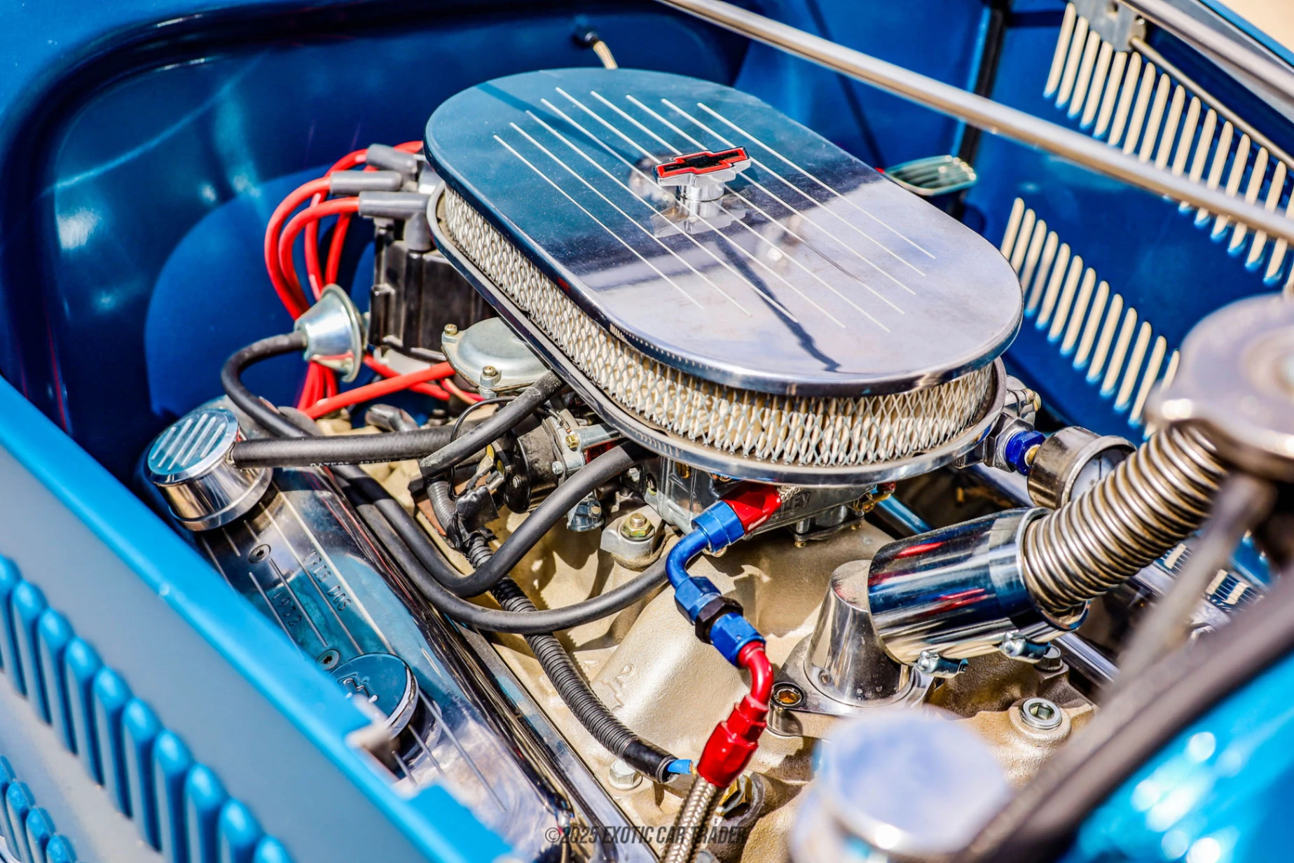 While the body stays true to its classic roots, this Model B Roadster’s upgrades bring it firmly into hot rod territory. Riding on polished Cragar rims with front disc brakes and rear drums, it presents a confident, street-ready stance. A pair of side-exit headers lend both visual flair and that unmistakable hot rod bark, and yes, the hood and ragtop are included in the sale for those days when you want to tone it down—just a little. The trunk is carpeted and features an automatic lift, adding an unexpected touch of convenience to the vintage aesthetic. Inside, the cockpit continues the theme: racing seats, blue and black interior trim, and upholstered doors give it a stripped-back, driver-focused feel. The dash is outfitted with custom diamond plate switchgear, and the quick-release steering wheel gives you that race-day energy every time you slide behind the wheel. A CD-capable AM/FM radio offers some modern comfort, though the real soundtrack is coming from that V8.