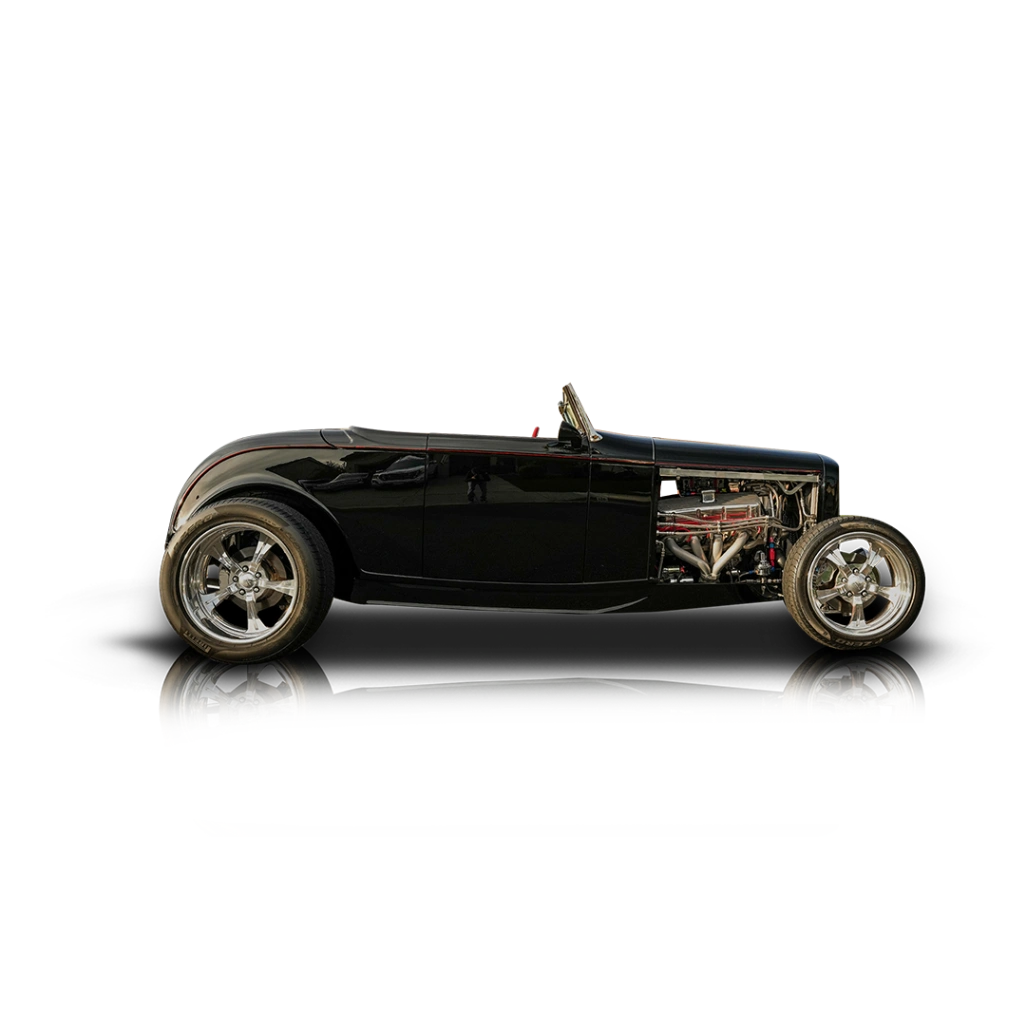 The black exterior highlights the iconic 1932 Ford roadster proportions, including the upright grille, open fenders, and folding manual soft top that tucks neatly behind the seats. Aftermarket wheels complement the aggressive stance, while four-wheel coilovers give the car a purposeful, planted look. Inside, the reupholstered red leather interior delivers a bold contrast against the black paint, creating a traditional hot rod color combination. The cabin is upgraded with an aftermarket sound system featuring Bluetooth capability, along with functional AC and heat for improved comfort. The layout remains clean and classic while integrating modern convenience discreetly.