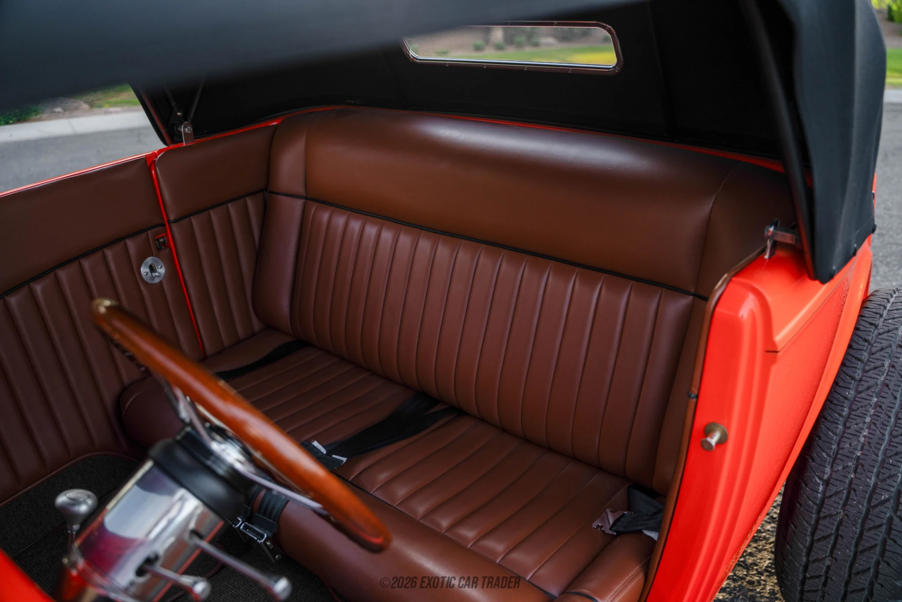 The exterior of this 1932 Ford Model B is dressed in a vibrant Hugger Orange that perfectly complements its classic lines, emphasizing its highboy stance. The vehicle features a full metal front end with louvered side panels and a louvered hood, showcasing its performance-oriented design. Inside the cabin, the Morocco Brown and Black Indigo upholstery provides a luxurious, custom feel, enhanced by full custom interior detailing. The appealing contrast of colors, along with German square weave carpeting, creates an inviting atmosphere, perfect for enjoyment during leisurely drives or car shows.