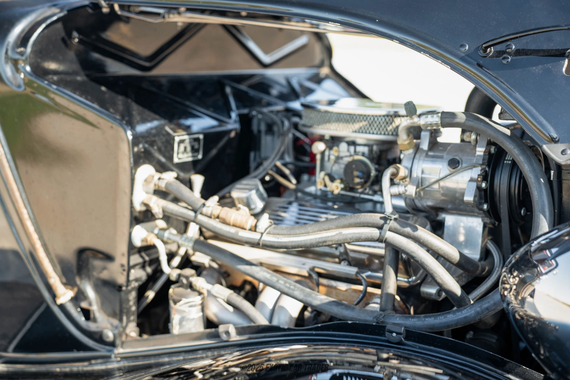 Black was very common as a car color in the Thirties, so it’s fitting that this 1934 Ford Model 40 Tudor Sedan Hot Rod comes in black. The rakish shape of the car’s roofline and bulbous styling really brings out its gangster pretentions, while its polished aluminum 5-hole wheels with custom V8 center caps add some glitz and glamor. These are wrapped with modern Goodyear Viva Touring radial tires – no cross-plies here. Then, we find an interesting hood ornament atop the chromed radiator grille. Finally, the whole thing sits on hydraulic air-lift suspension, allowing you to adjust the ride height accordingly. The custom red interior of this 1934 Ford Model 40 Tudor Sedan Hot Rod has been upgraded with air conditioning to keep everyone comfortable. Accessed via rearward-hinged doors, up to four adults can travel within this vehicle’s passenger cabin. There’s also cruise control, and a Kenwood head unit driving some Pioneer speakers for your music.