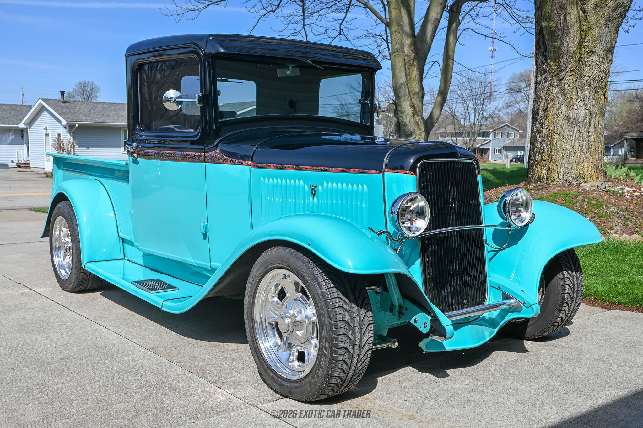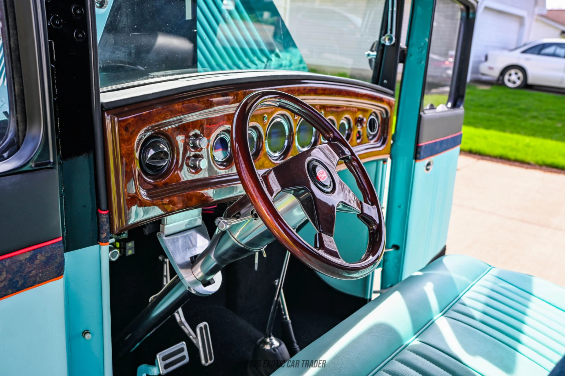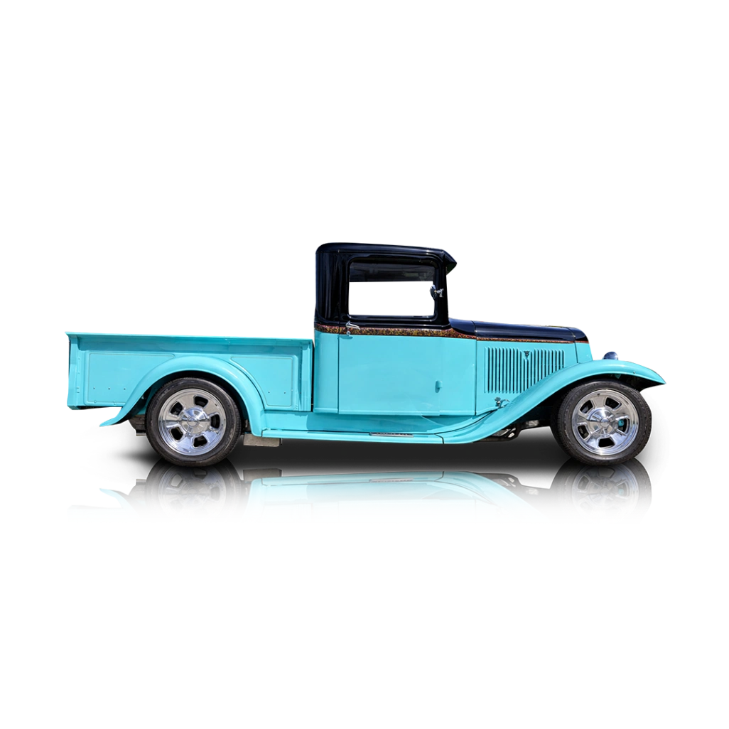 The exterior of this 1934 Ford Pickup Custom Street Rod is finished in a striking turquoise and black two-tone custom paint job that highlights its classic lines while giving it a bold, modern twist. The body sits confidently thanks to an upgraded aftermarket suspension, while aftermarket wheels enhance both stance and style. A custom wood bed adds a touch of craftsmanship and authenticity to the rear, contrasting nicely with the glossy paint. Additionally, the custom fabricated undercarriage reflects the level of detail put into this build, ensuring it looks just as impressive underneath as it does on the surface. The interior of this 1934 Ford Pickup Custom Street Rod continues the vibrant theme with a fully reupholstered turquoise cabin that feels both retro and refreshed. A woodgrain dashboard adds a classic hot rod aesthetic, while modern touches like digital gauges provide improved functionality and readability. The aftermarket steering wheel enhances driver engagement, and conveniences such as air conditioning and an upgraded sound system make this truck comfortable for extended drives. Altogether, the interior strikes a great balance between vintage inspiration and modern usability.