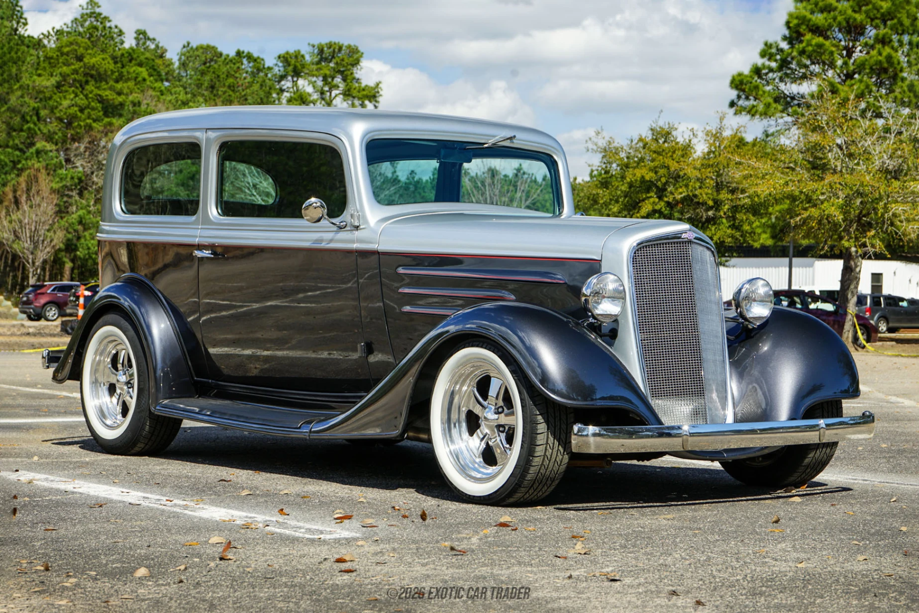 The exterior showcases the iconic styling of the mid-1930s, highlighted by flowing fenders, a tall chrome grille, and classic body lines that define pre-war American design. The custom gray and silver paint job is accented with hand-applied red pinstriping, adding a subtle but striking contrast that emphasizes the car’s sculpted hood vents and body contours. The stance is enhanced by aftermarket wheels wrapped in wide whitewall tires, giving the car a traditional hot rod look while maintaining a clean and refined presence. Inside, the cabin has been fully updated with a reupholstered beige interior that provides both comfort and a refined appearance. The interior retains its classic dashboard design but incorporates modern touches including an aftermarket gauge cluster, a Grant steering wheel, and an upgraded sound system. Additional upgrades such as aftermarket safety harnesses and Vintage Air air conditioning and heating bring modern comfort and usability to this classic sedan, making it well suited for cruising in a variety of driving conditions.
