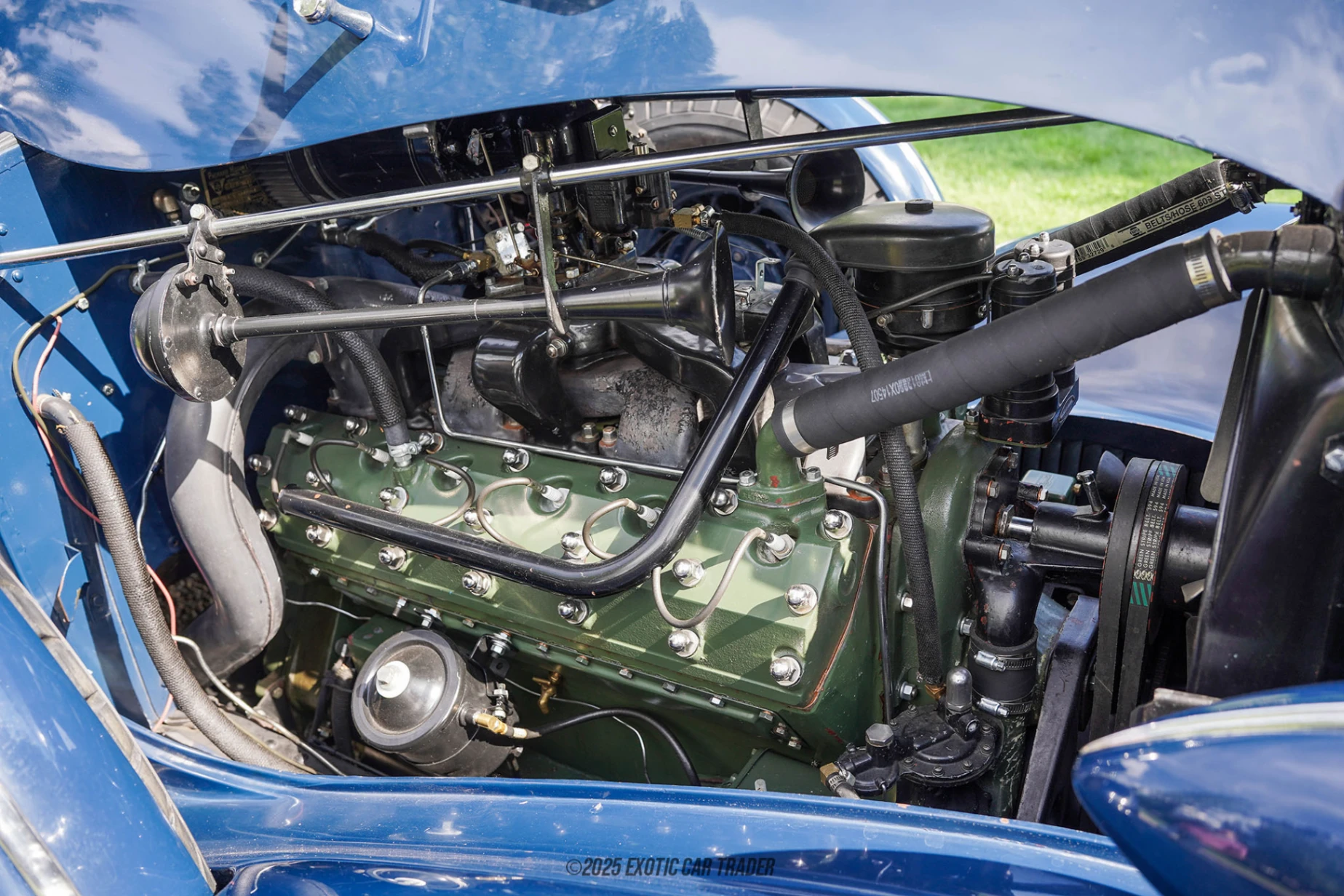 Finished in a stately dark blue, the Packard Twelve 1208 exudes grandeur with its imposing proportions and period-defining details. A tall vertical grille, prominent hood ornament, dual side-mounted spare tires, running boards, wire wheels with wide whitewall tires, and an externally mounted luggage trunk with rack all emphasize its commanding presence. Dual side-hinged hoods and the limousine-style bodywork reinforce its era-specific opulence, capturing the spirit of 1930s luxury transportation. Inside, the cabin offers a chauffeur-passenger division, with the driver’s compartment trimmed in durable black leather for utility, while the rear passenger compartment showcases tan cloth upholstery, wood grain accents, and refined craftsmanship throughout. Features include a Dictaphone, radio, heater, cigar lighter, and folding jump seats integrated into the partition. A winder-controlled glass division allows discreet communication between passengers and chauffeur, while an intercom-style microphone and speaker system further elevate convenience. The balance between durability in the front and elegance in the rear reflects the chauffeur-driven design philosophy of the time.