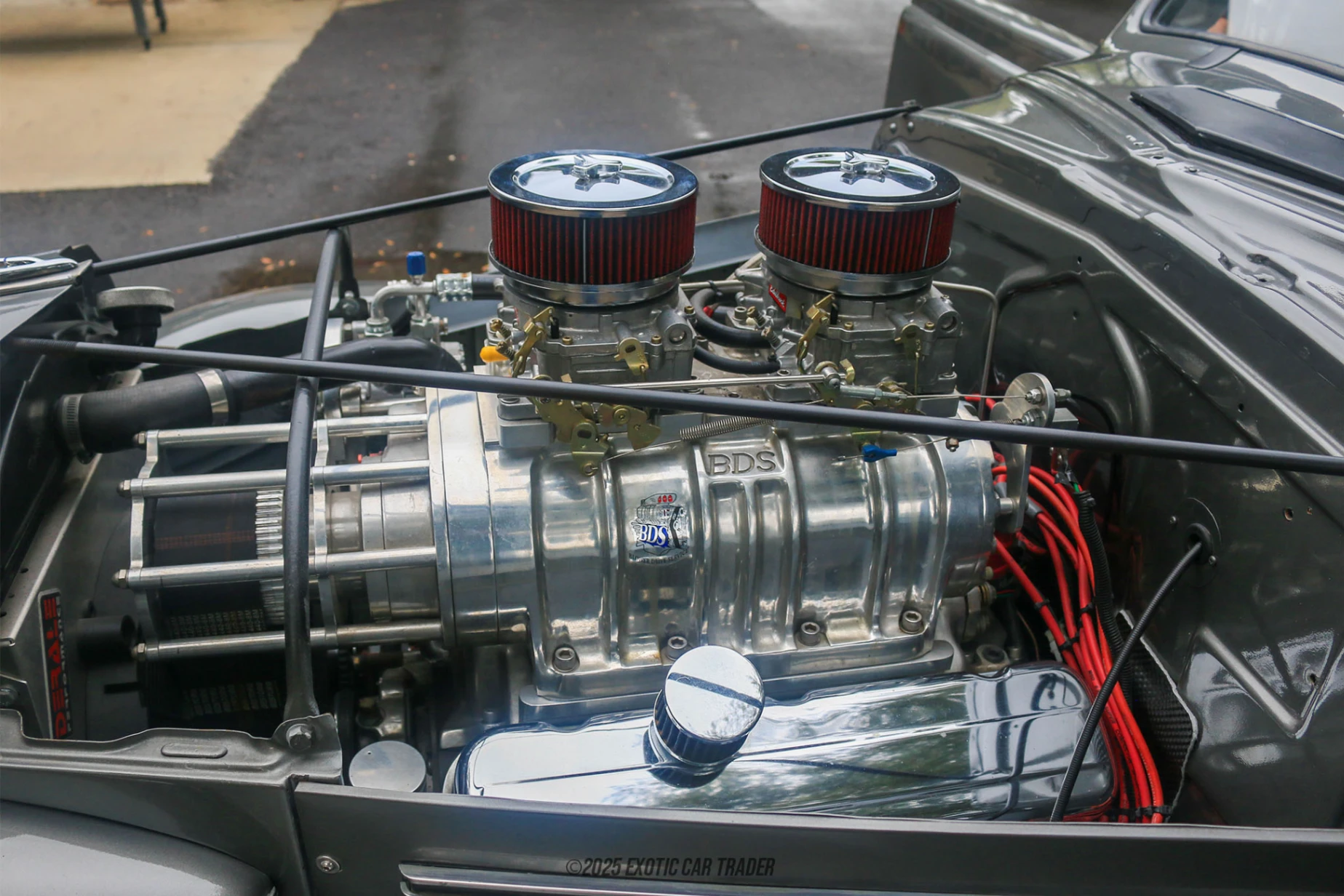 Power is supplied by a 427ci tall-deck supercharged V8 equipped with a BDS Roots-style supercharger and dual four-barrel carburetors, providing performance far beyond the vehicle’s original specifications. Power is delivered through a TH400 three-speed automatic transmission to a rear end with a 3.73 gear ratio, offering a balance between strong acceleration and highway drivability. A custom chassis supports the drivetrain, complemented by four-wheel disc brakes and air conditioning, resulting in a mechanically robust build designed for confident modern road manners while accommodating the engine’s substantial output.