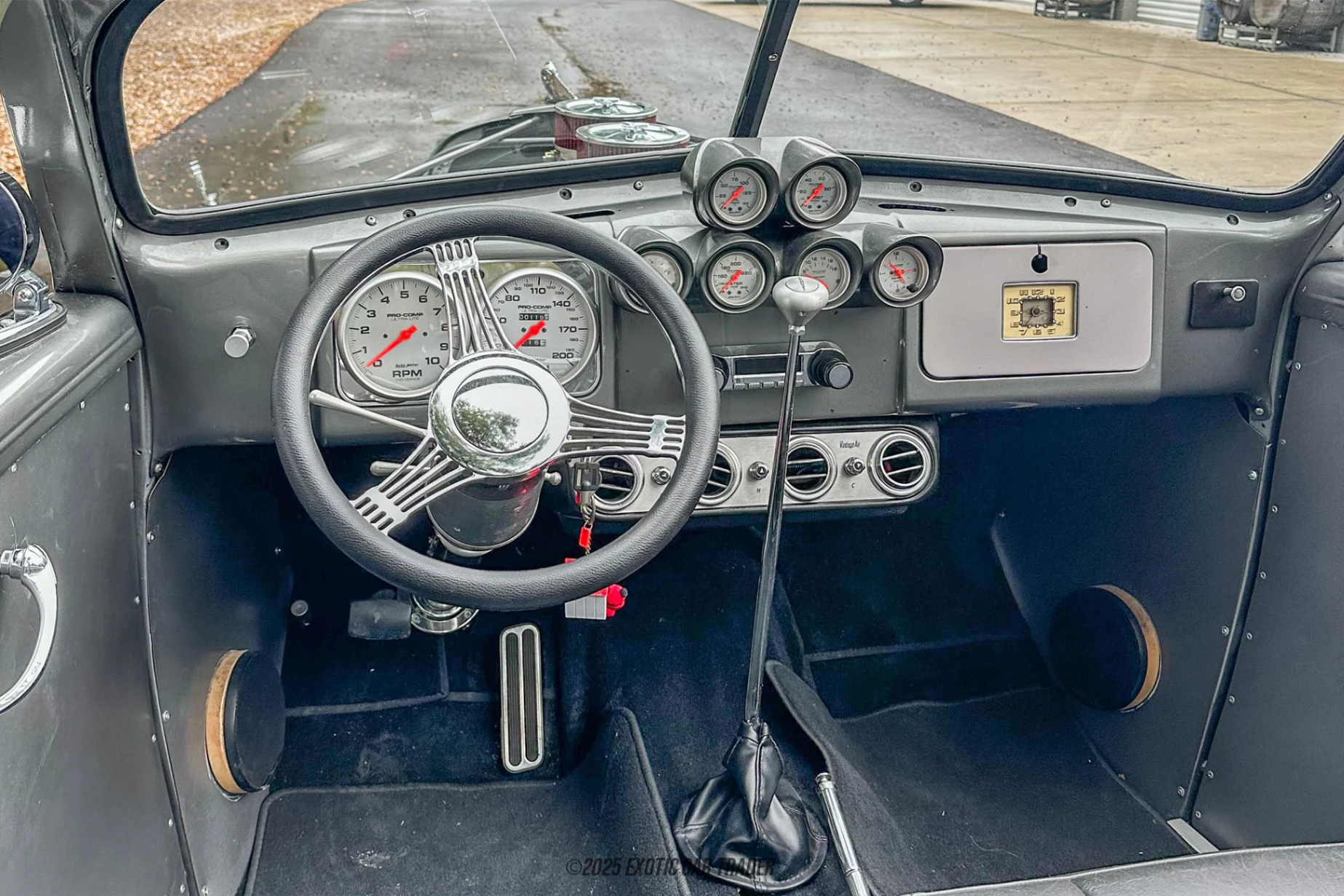 The exterior of this 1937 Buick Special Series 40 Convertible features a custom Corvette-style silver finish that highlights the flowing fenders, long hood, and low stance characteristic of the Series 40, while polished brightwork and aftermarket wheels add a restrained modern contrast. The Carson-style removable top maintains a period-correct convertible appearance while enhancing usability. Inside, the black interior is cleanly executed with custom upholstery, a modern gauge cluster integrated into a simplified dashboard, and an aftermarket sound system discreetly incorporated to retain a vintage visual character while offering contemporary functionality.