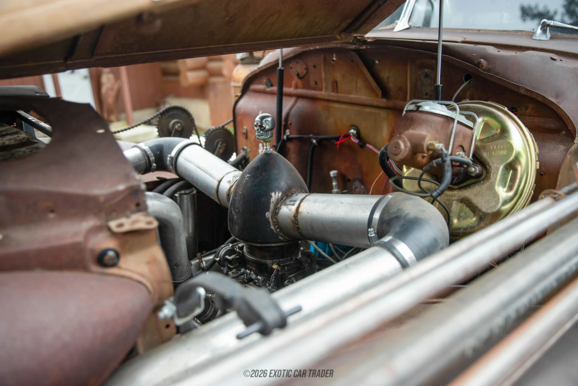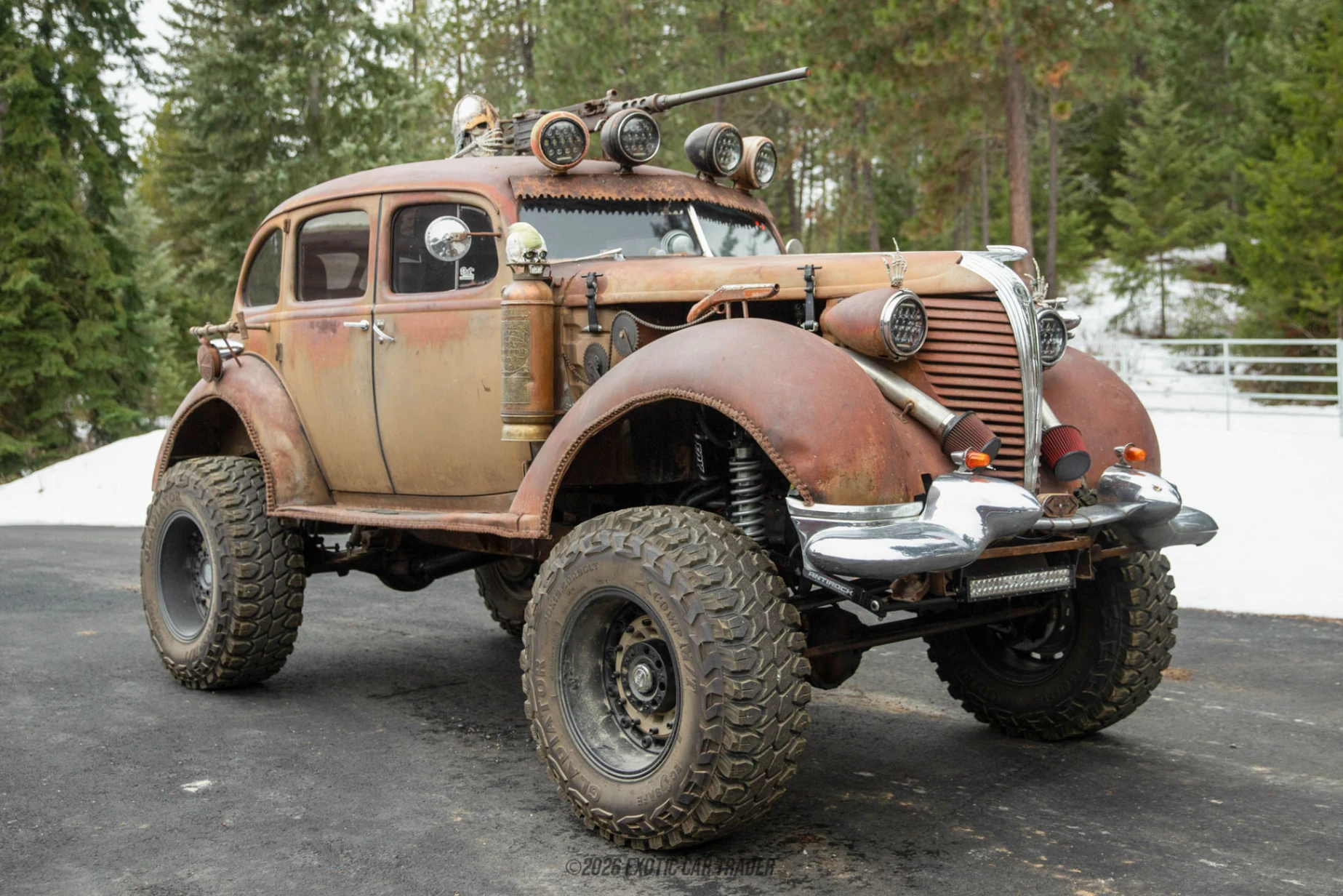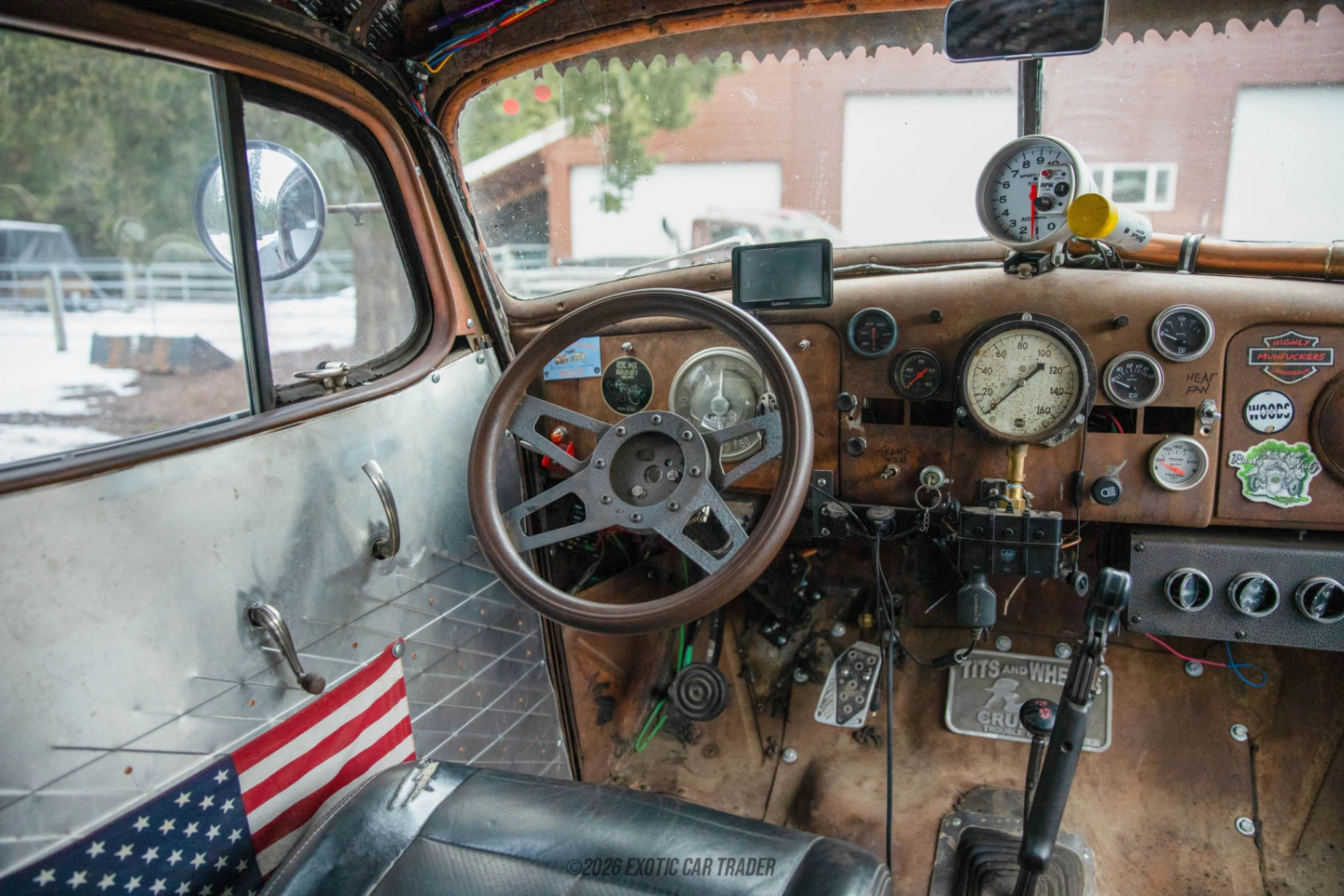 Wearing its original patina-finished steel body, this Hudson Terraplane showcases authentic surface wear that tells a story rather than hiding it. The brown patina finish, combined with exposed hardware and custom details, reinforces the vehicle’s industrial, utilitarian aesthetic. Roof-mounted auxiliary LED lights and custom hood-mounted intake plumbing add both function and visual drama, while the lifted stance on 20-inch beadlock-style wheels and massive 40-inch Gladiator X Comp M/T tires gives the car a commanding, almost post-apocalyptic presence. Inside, the reupholstered black leather interior blends ruggedness with comfort. The cabin features a minimalist, functional layout with aftermarket gauges, a prominent tachometer, and a purposeful driving position. Heat is present for cold-weather use, while the absence of air conditioning stays true to the stripped-down rat rod ethos.