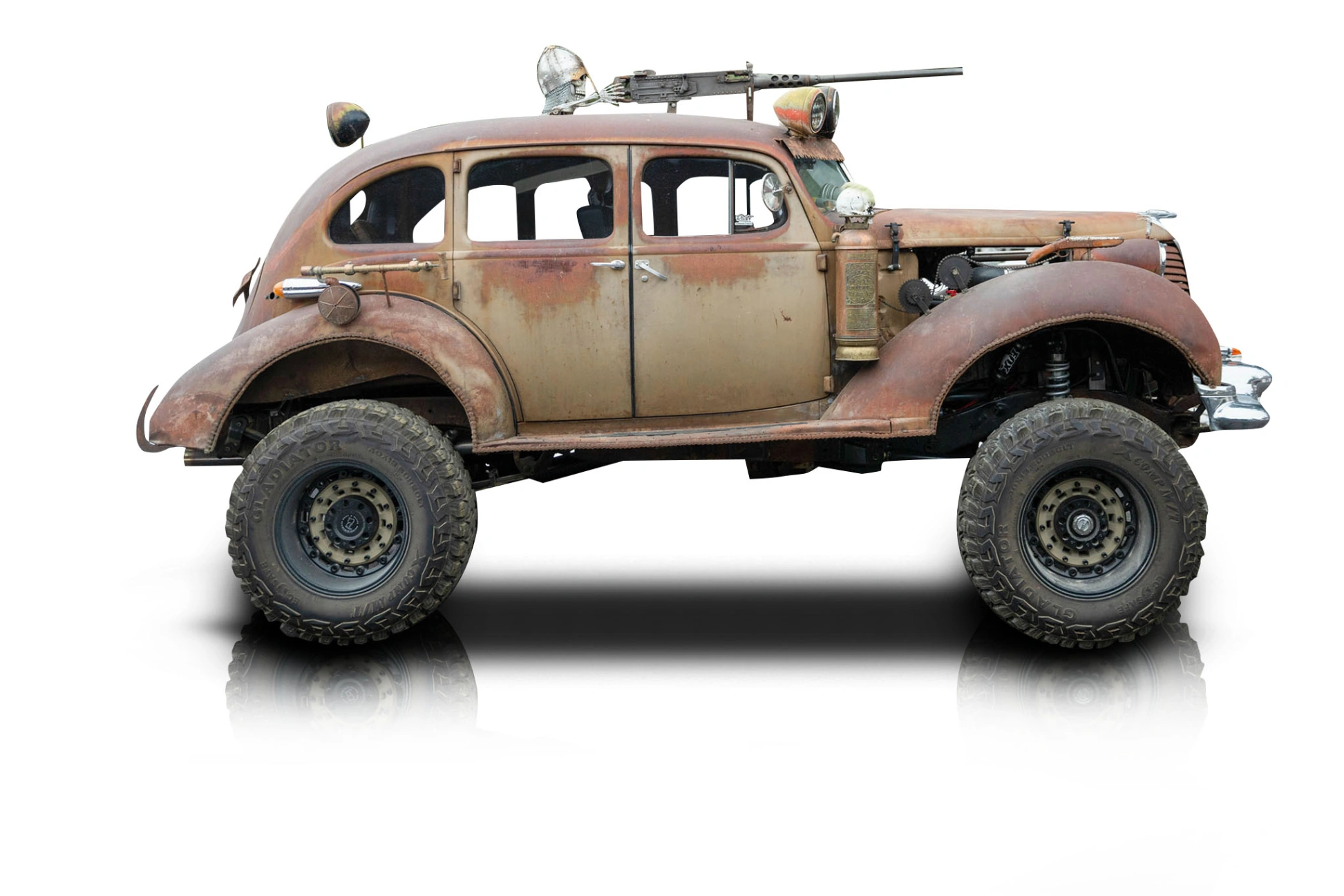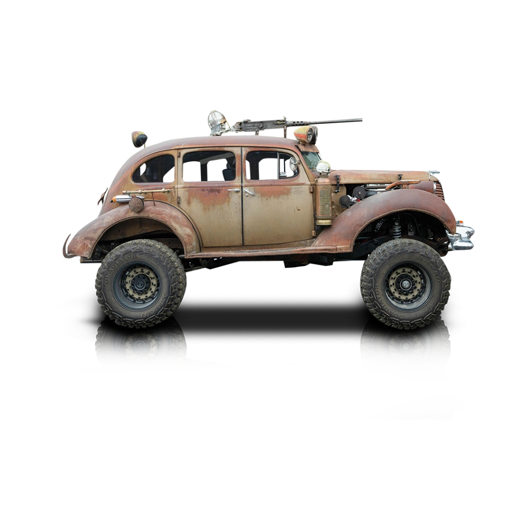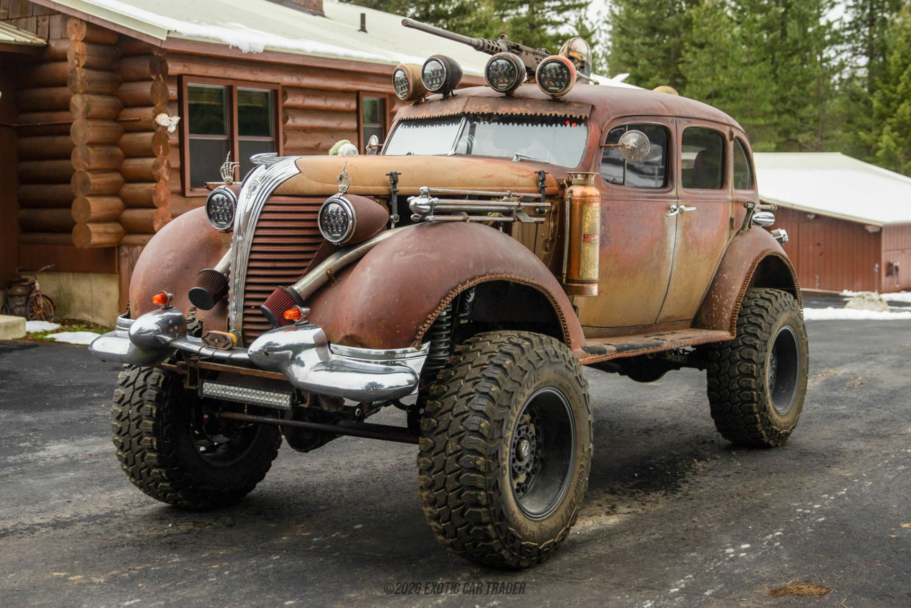 Wearing its original patina-finished steel body, this Hudson Terraplane showcases authentic surface wear that tells a story rather than hiding it. The brown patina finish, combined with exposed hardware and custom details, reinforces the vehicle’s industrial, utilitarian aesthetic. Roof-mounted auxiliary LED lights and custom hood-mounted intake plumbing add both function and visual drama, while the lifted stance on 20-inch beadlock-style wheels and massive 40-inch Gladiator X Comp M/T tires gives the car a commanding, almost post-apocalyptic presence. Inside, the reupholstered black leather interior blends ruggedness with comfort. The cabin features a minimalist, functional layout with aftermarket gauges, a prominent tachometer, and a purposeful driving position. Heat is present for cold-weather use, while the absence of air conditioning stays true to the stripped-down rat rod ethos.