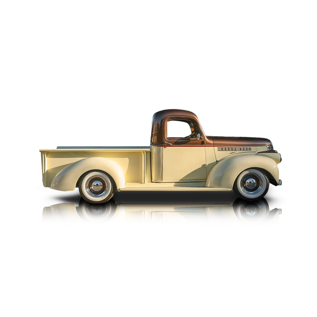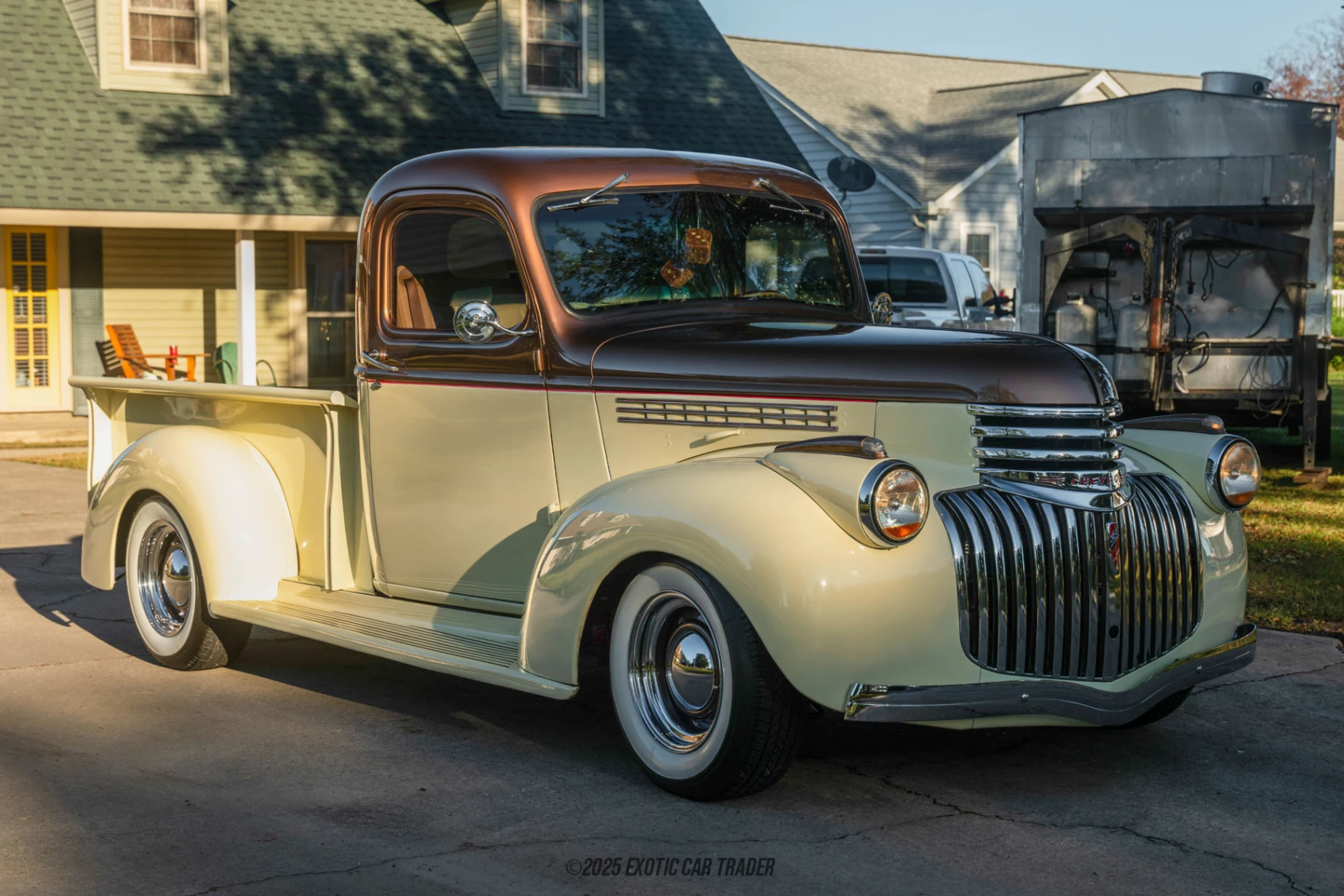 The exterior showcases the rounded fenders, upright grille, and flowing body lines that define early-1940s Chevrolet truck design. The two-tone paint scheme highlights the truck’s curves and reinforces its period-correct appearance, while factory-style steel wheels fitted with wide whitewall tires complete the classic look. Inside, the cabin maintains a simple and utilitarian layout, featuring a bench seat, painted metal dashboard, and traditional gauge arrangement. Subtle updates such as an aftermarket steering wheel and modern radio improve comfort and functionality while preserving the truck’s original visual character.