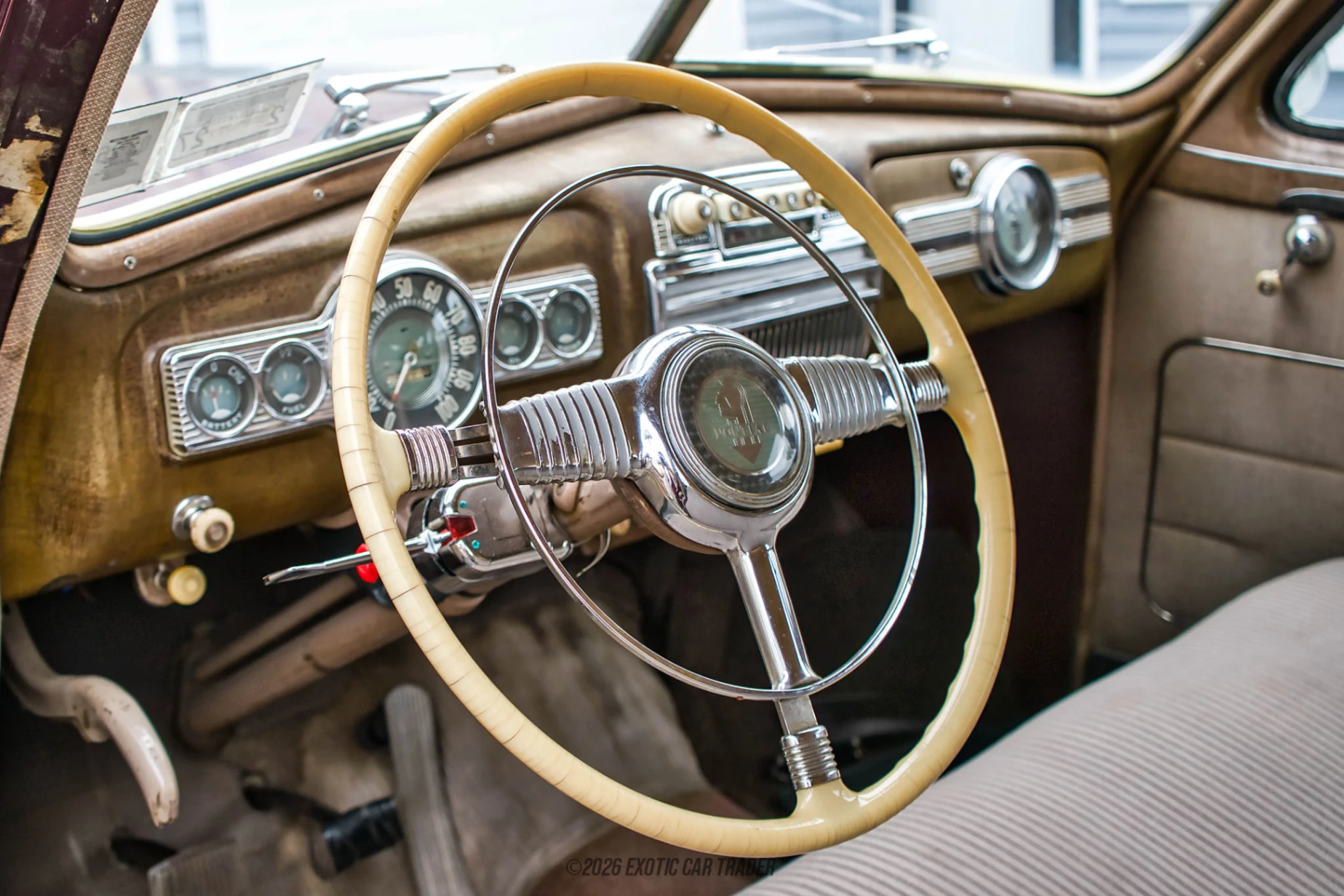 Painted in maroon, this 1946 Pontiac Streamliner Sedan sports chrome front and rear bumpers, as well as steel wheels with Pontiac hubcaps. The car’s design is definitely the biggest talking point, and might even be referred to as sporty. While the front is typical Forties fare with a bulbous nose, circular headlamps and a chromed grille, as we move our attention towards the side profile, the dramatic, aerodynamic, streamlined shape of the car becomes apparent. When most Forties cars had equally bulbous rears with defined trunks, this car’s rear design seamlessly flows. It’s indeed something to behold, and before we venture aboard, let’s also take a moment to appreciate the split windshield up front. And no, it doesn’t affect visibility as much as you’d think. The tan cloth interior of this 1946 Pontiac Streamliner Sedan does show some wear here and there, but that’s to be expected from an eight-decade survivor. It’s got bench seating at the front as well as rear. The dashboard looks superb for its age, as do the gauges, as well as the controls for the car’s heater and defroster.