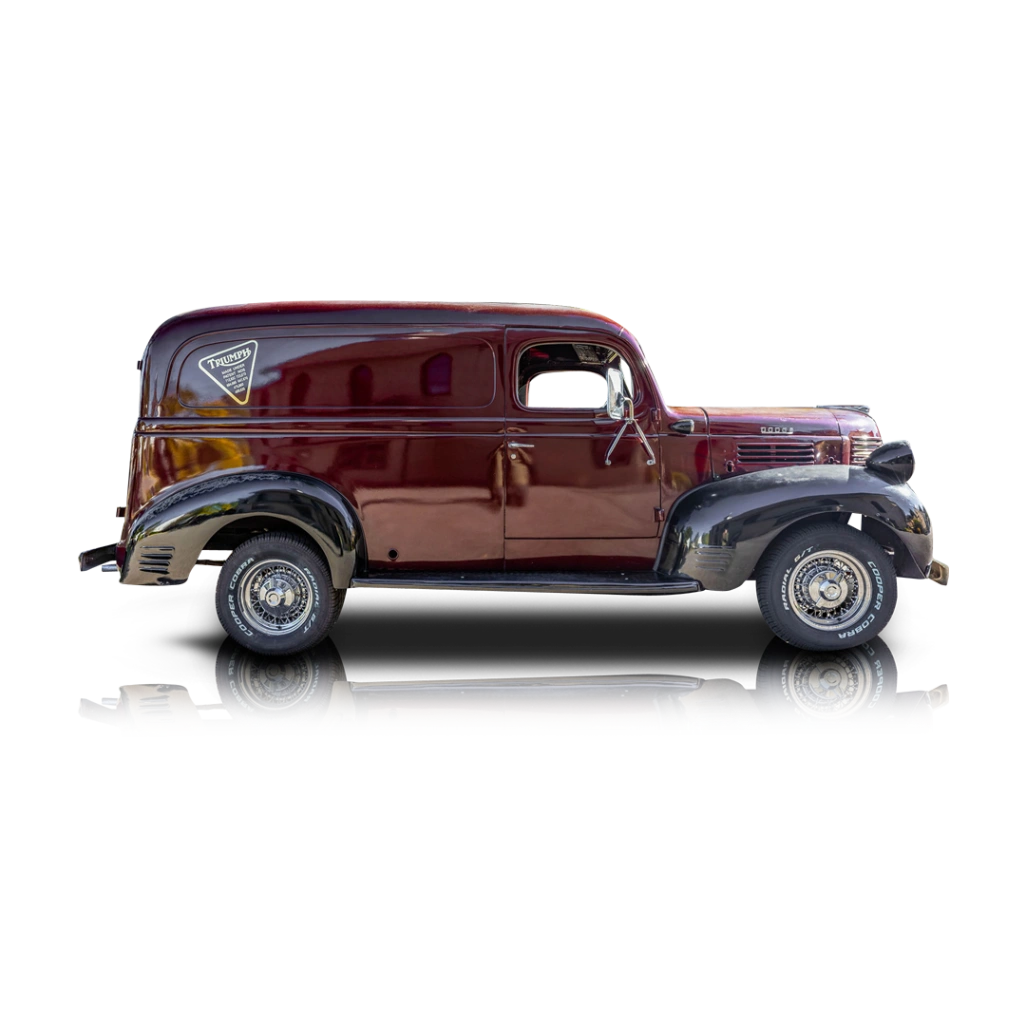 Finished in a deep Burgundy & Black combination, this Dodge boasts gracefully curved fenders, a split windshield, and signature vertical grille bars that capture the late-’40s Art Deco influence. The rear quarter panels display a period-correct “Triumph” patent decal, reflecting its vintage commercial roots — a nod to the equipment and branding often used on working delivery trucks of the era. Inside, the cabin retains its authentic industrial feel with maroon embossed vinyl upholstery, a painted metal dashboard, and simple, durable switchgear. Functionality and style coexist, preserving the truck’s original utilitarian charm.