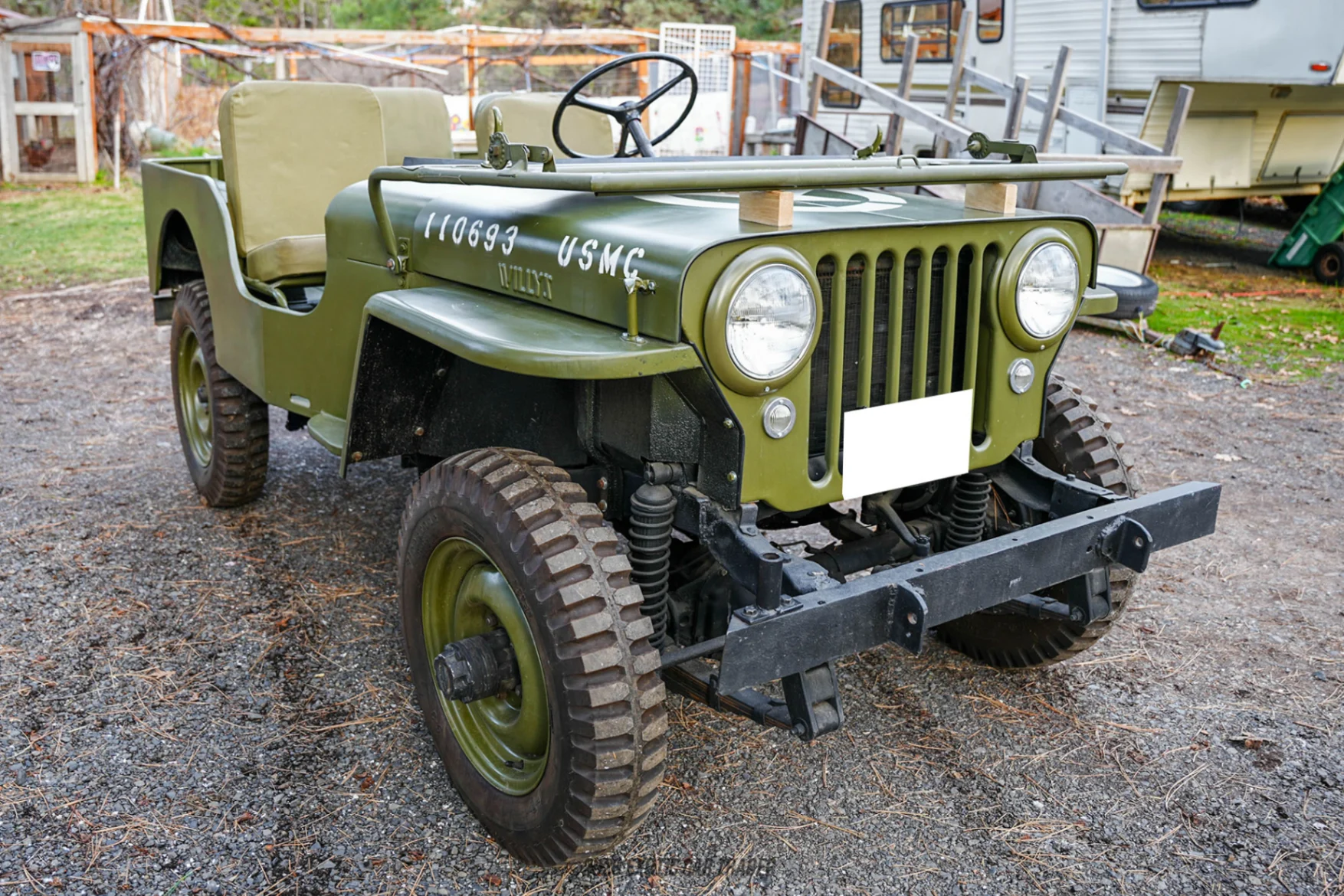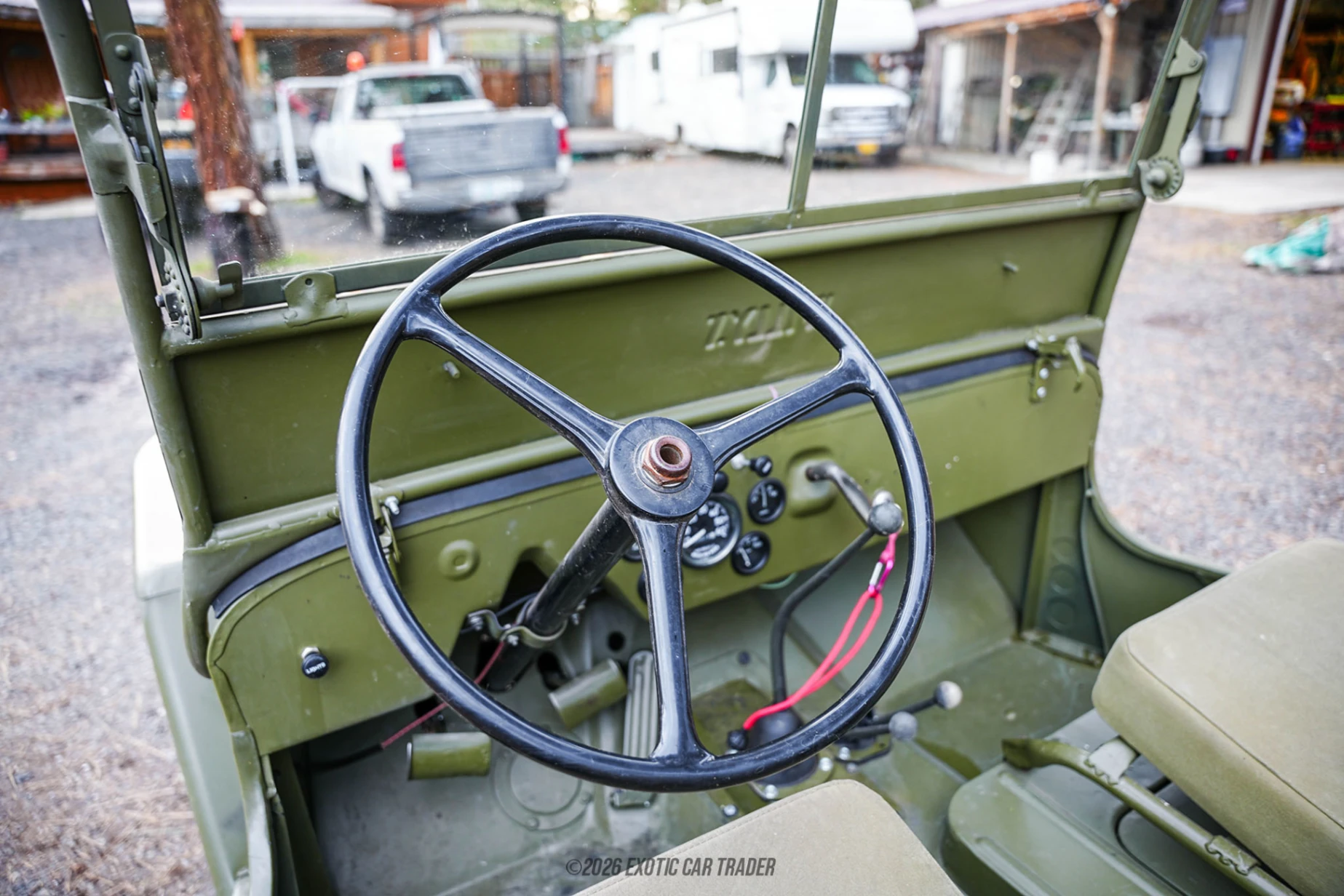 The military green exterior highlights the Jeep’s minimalist body lines, exposed hardware, and signature seven-slot grille. The foldable windshield remains a defining feature, reinforcing its agricultural and off-road roots. Inside, the matching military green interior maintains a no-frills, functional layout with durable surfaces and straightforward controls. The cabin stays true to the original utility-first philosophy of the CJ-2A while benefiting from updated wiring for improved reliability.