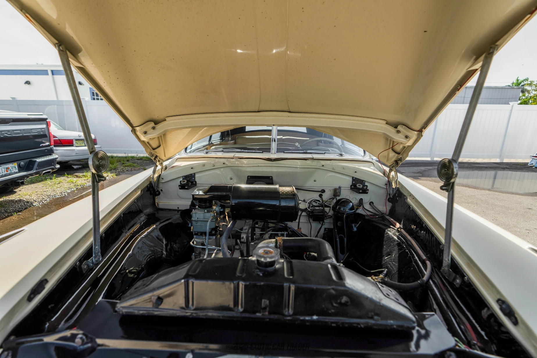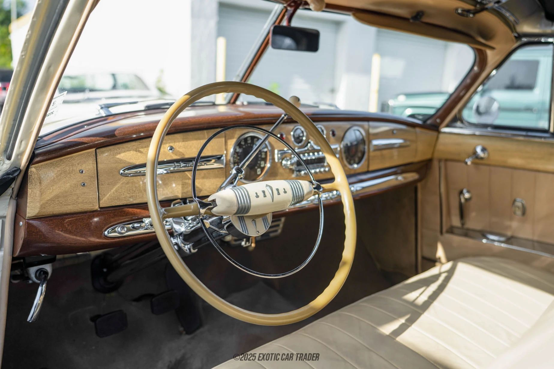The cream colored bodywork of this 1949 Hudson Commodore Six Convertible is perfectly representative of automotive design in the 1940s. The curvaceous outlook, bulbous fenders and chrome bumpers are all present and correct with this car, which rides on whitewall tires and features large Hudson hubcaps protecting its steel wheels. If you look closer at the monobuilt semi-unit body with step-down design, you’ll note a subtle two-tone paint scheme at play. The car’s convertible top, of course, comes in black. There’s even a convertible top boot to ensure that the car’s clean lines are not disturbed when the top has been lowered and stowed in place. The interior of this 1949 Hudson Commodore Six Convertible comes in white and features amenities such as power windows and an AM radio. You’ve got plenty of wood trim and some chrome embellishing the interior too, which can accommodate up to four adults in comfort. Even the trunk is pretty spacious, with the spare tire neatly concealed within its custom cover.