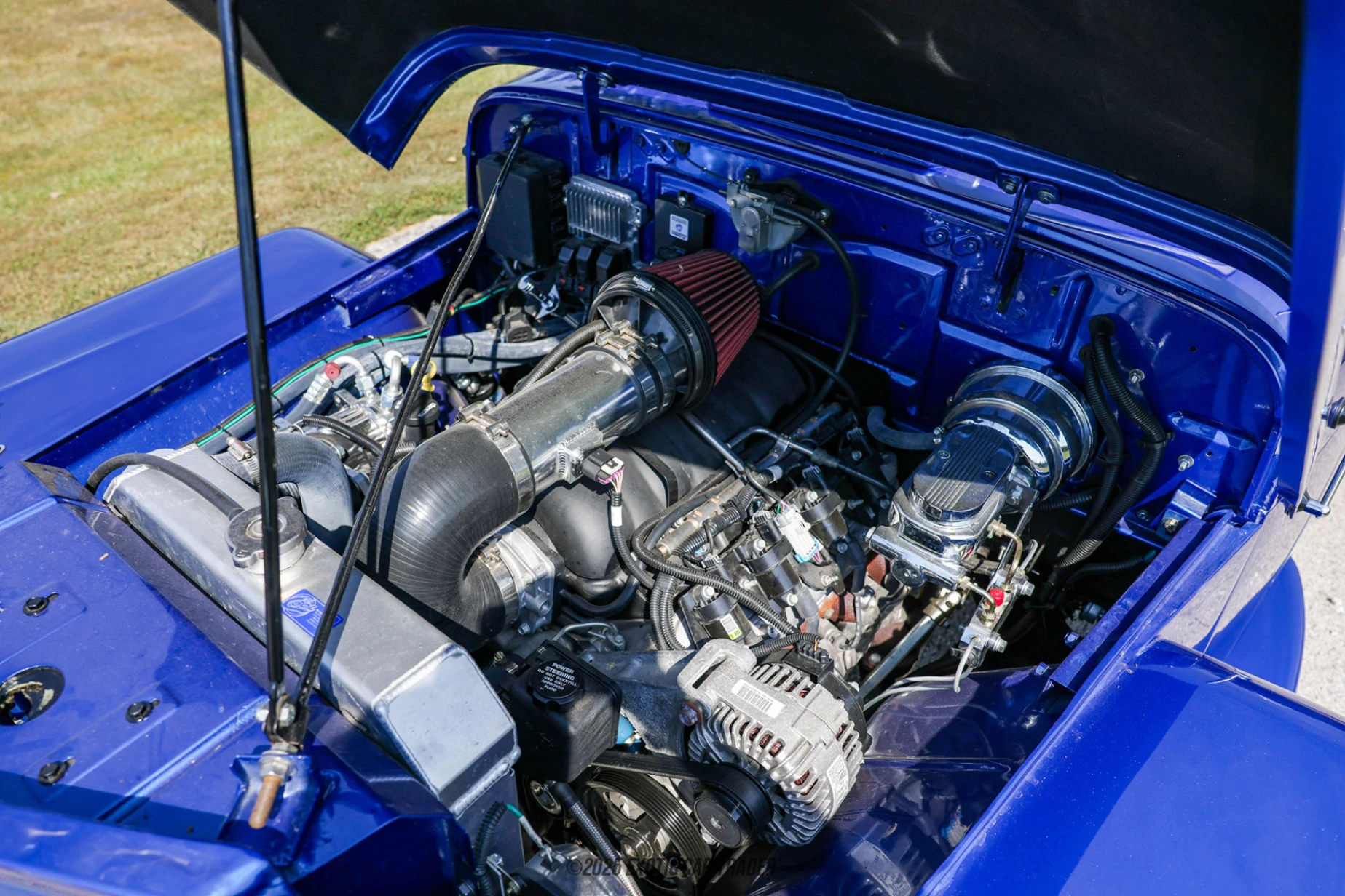 Finished in blue with a grey soft convertible top, this Jeepster maintains its distinctive proportions while gaining visual flair from aftermarket wheels and a rear-mounted spare tire. The restored bodywork highlights its postwar design roots, while dual exhaust outlets hint at the modern performance lurking beneath. Inside, the cabin is finished in grey and equipped with Dolphin digital gauges and an upgraded billet chrome tilt steering wheel, combining vintage inspiration with modern precision and style.