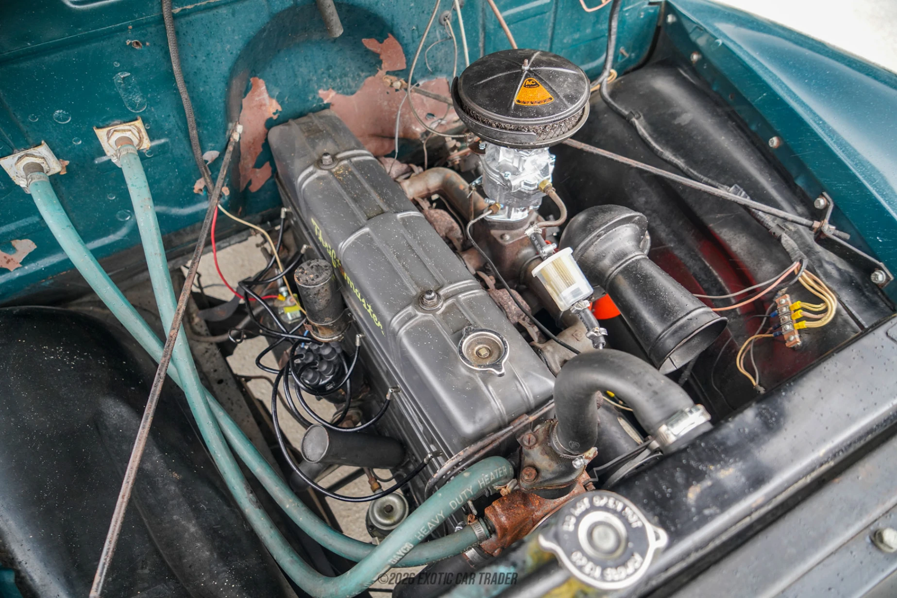Under the hood is Chevrolet’s 216-cubic-inch inline-six, a naturally aspirated engine originally rated at 85 horsepower at 3,300 RPM. The truck has benefited from recent recommissioning work to ensure proper operation after its long period in storage. An aftermarket fuel tank was installed, and the carburetion system was serviced—initially fitted with an aftermarket carburetor before the original Rochester carburetor was refreshed and reinstalled. The result is a truck that reportedly runs very well, maintaining the simple and durable mechanical character that made Chevrolet’s Stovebolt six-cylinder engines famous.