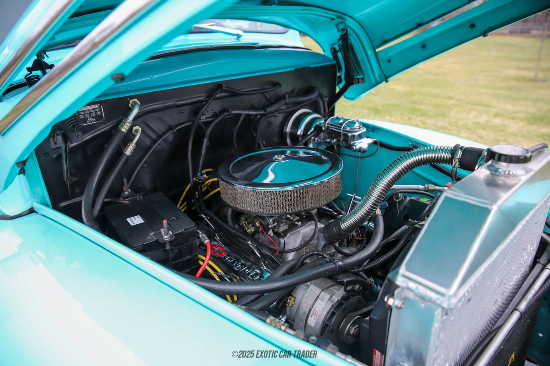 The 350ci V8 that moves this 1950 Ford F-1 Restomod is paired with a 3-speed automatic transmission with overdrive, and a Ford 9-inch rear end. We’re told that the truck has electric radiator fans, and previously replaced brake lines for the 4-wheel disc brakes with power assistance. The steering is also power assisted, and the wiring harness has reportedly been previously replaced as well.