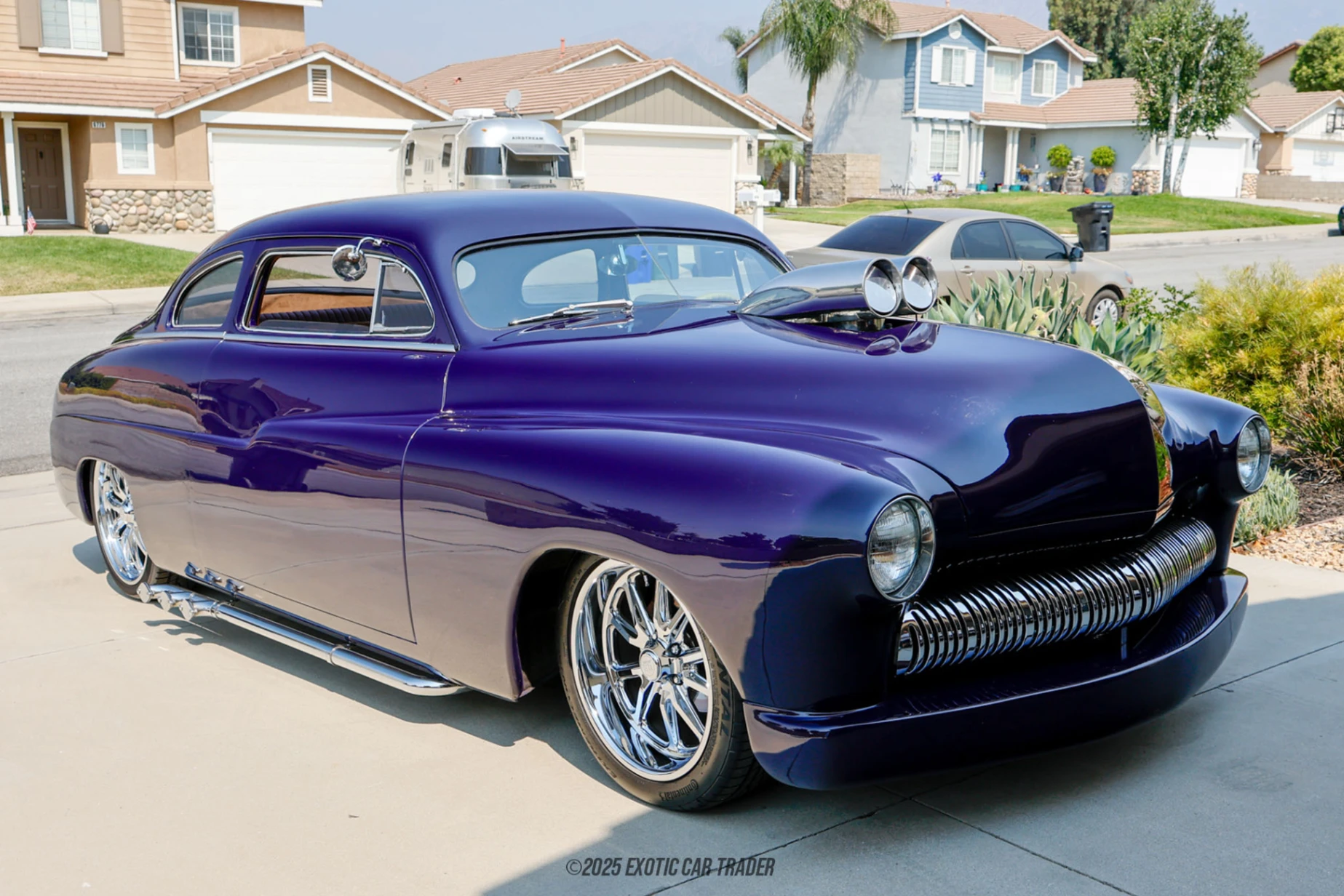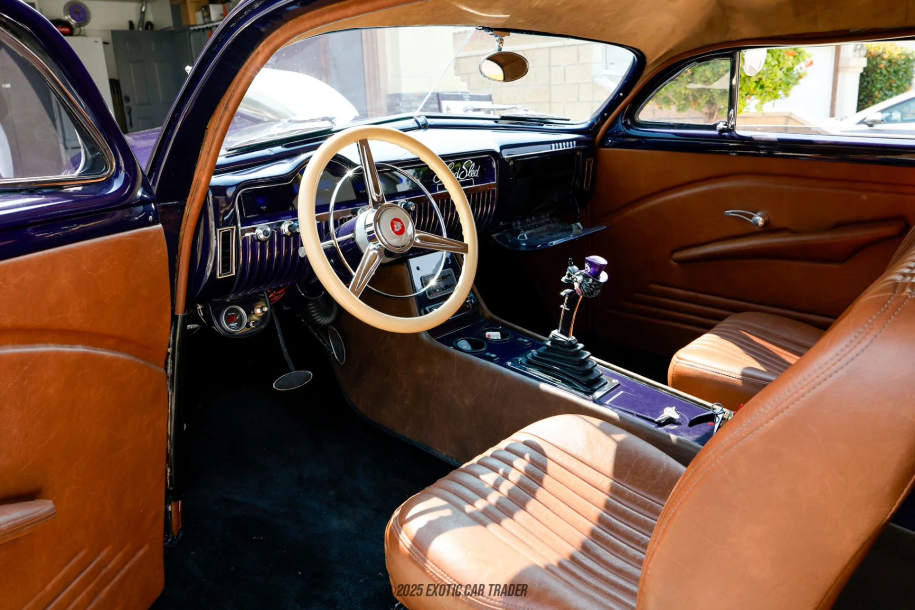 This 1950 Mercury Eight Coupe Restoration is definitely a restomod, judging by its custom paint job that sees shades of purple and blue masterfully mixed into a final product that’s alluring in any light. The car’s low-slung, swoopy design has been further accentuated by its shiny silver chromed alloy wheels and chrome tailpipes at the rear. You’ll also note the shaved bumpers for that clean look, as well as the prominent chromed grille that just screams vintage. The interior of this 1950 Mercury Eight Coupe Restoration is a custom job in tan and black. The dashboard retains much of its vintage vibe, as does the white thin-rimmed steering wheel with chrome ring. However, the center console hosts the control panel for the car’s Vintage Air heating and air conditioning system, as well as a Sony radio with CD player and USB input. You’ve also got an aftermarket rear-view mirror for safer driving in today’s traffic conditions.
