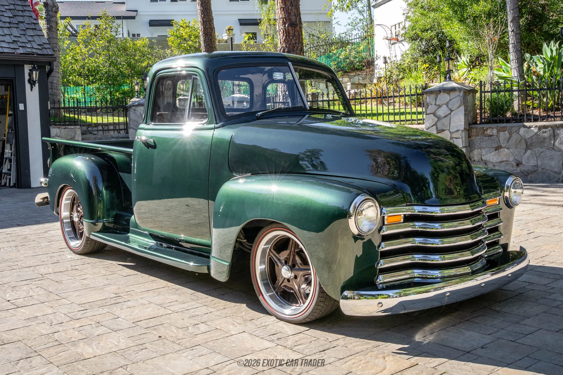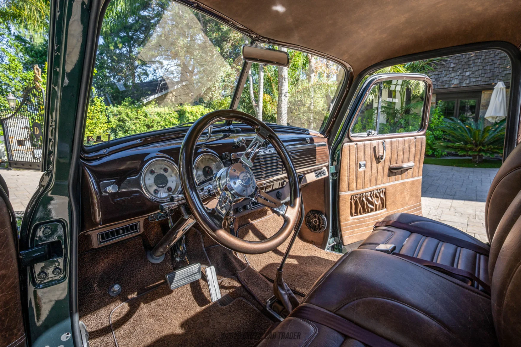 The exterior is finished in a rich custom green paint that accentuates the truck’s flowing body lines and chrome trim, while subtle modifications such as smoothed running boards and a shaved firewall contribute to a clean, refined presentation. Large-diameter Billet Specialties wheels provide a modern stance without overpowering the original design. Inside, the cabin has been tastefully updated with a chrome steering column, modernized controls, and a RetroSound audio system with Bluetooth capability. A hidden air conditioning system is seamlessly integrated, preserving the vintage appearance while enhancing everyday comfort.