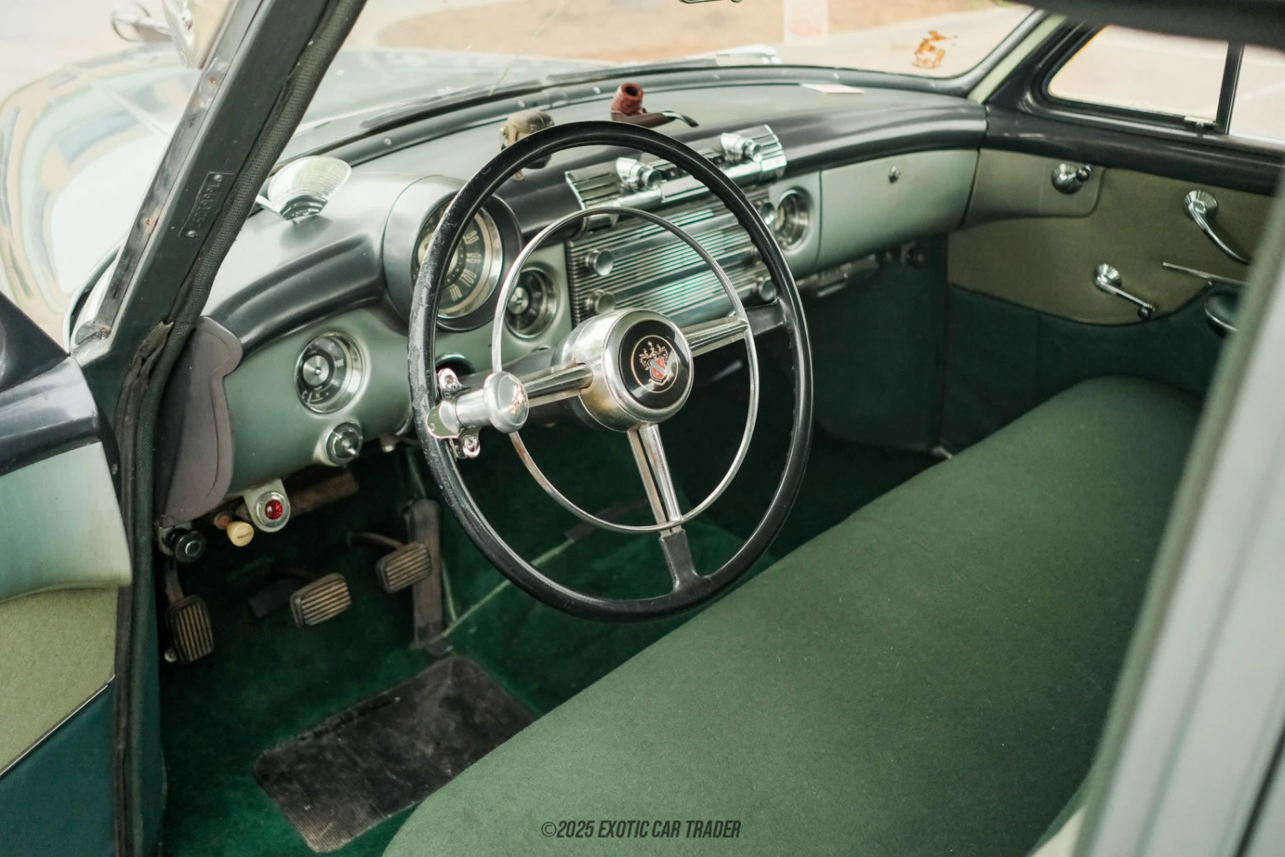 Draped in an elegant shade of period-correct green, this 1952 Buick Super four-door sedan embodies the timeless design language of the late Forties and early Fifties. Its rounded body lines, abundant chrome, and partially faired rear wheels reflect the confident styling of postwar America. Details such as the externally mounted front sun visor, bumper-integrated parking lamps housed in chrome pods, and matching rear pods containing the reversing lights further emphasize the car’s distinctive era-specific character. Completing the look are chrome bumpers, mirrors, and trim, along with polished hubcaps wrapped in classic wide whitewall tires. Inside, the cabin is a quintessential Fifties environment. The front and rear bench seats feature a two-tone green and cream motif, exuding a period charm that harmonizes with the car’s exterior. The front bench is adjustable for comfort, while the rear offers a fold-down center armrest and a chrome-trimmed grab handle for added convenience—particularly thoughtful for older passengers. The dashboard presents a beautiful array of chrome accents, housing an AM/FM radio that adds to the car’s nostalgic appeal. Though air conditioning wasn’t standard fare in 1952, enthusiasts will appreciate the authenticity of its unaltered, period-correct interior.