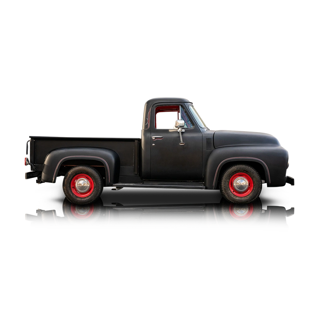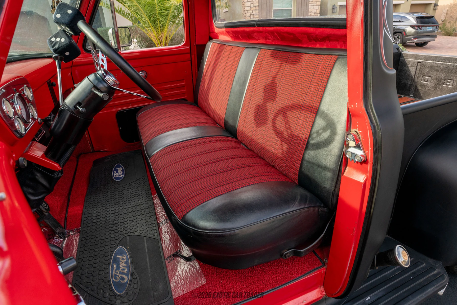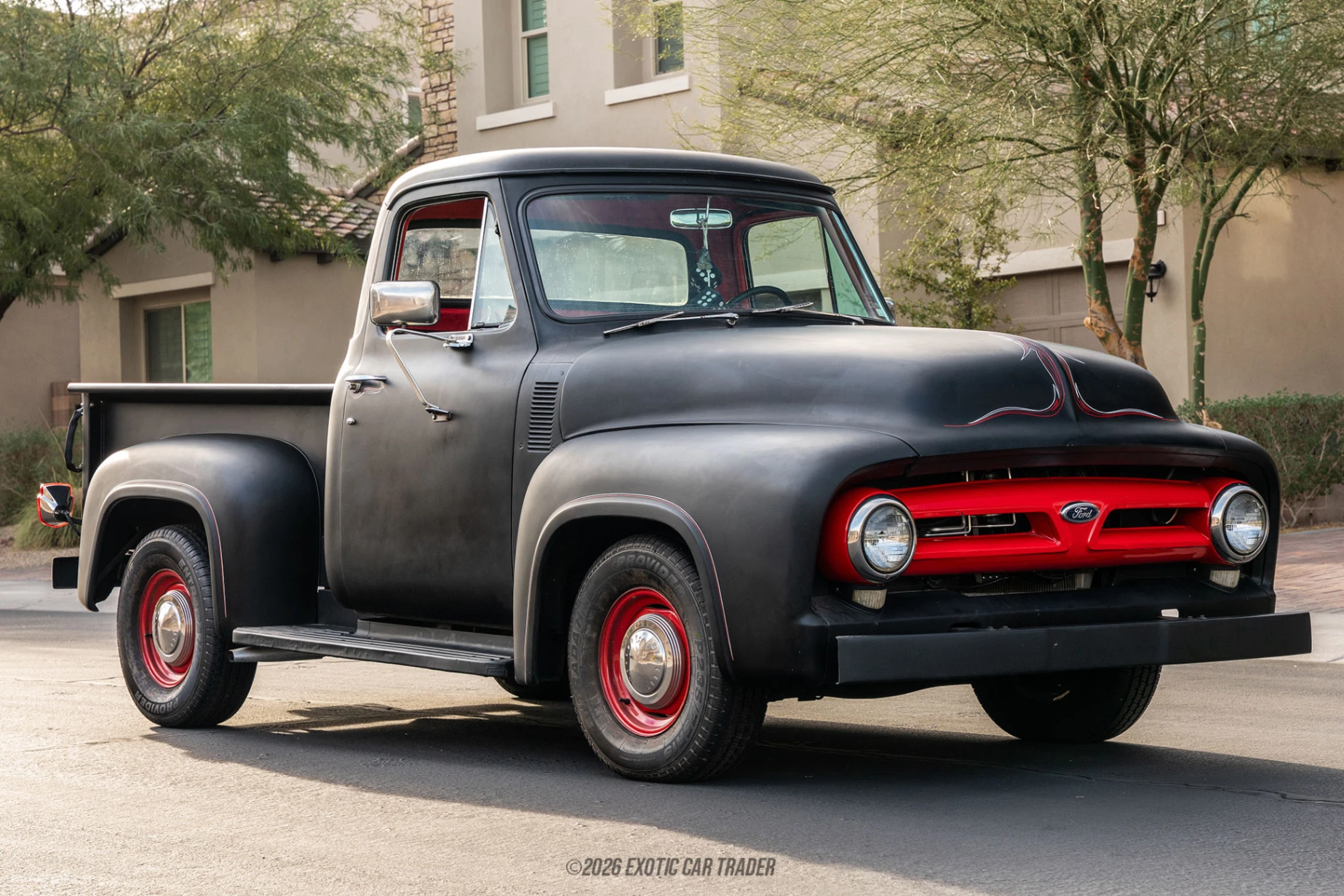 The exterior of this 1953 Ford F-100 is finished in a matte black custom paint job, presenting a subdued, aggressive look that highlights the truck’s rounded fenders and simple body design. Aftermarket wheels complement the overall stance, while the oak bed with wood flooring and metal strips adds both visual appeal and functional durability. Inside, the cabin features a reupholstered black and red bench seat, paired with aftermarket carpeting and a custom headliner for a cleaner, more refined appearance. An aftermarket steering wheel and tilt steering column improve driving comfort, while the overall interior layout maintains a classic hot-rod aesthetic.
