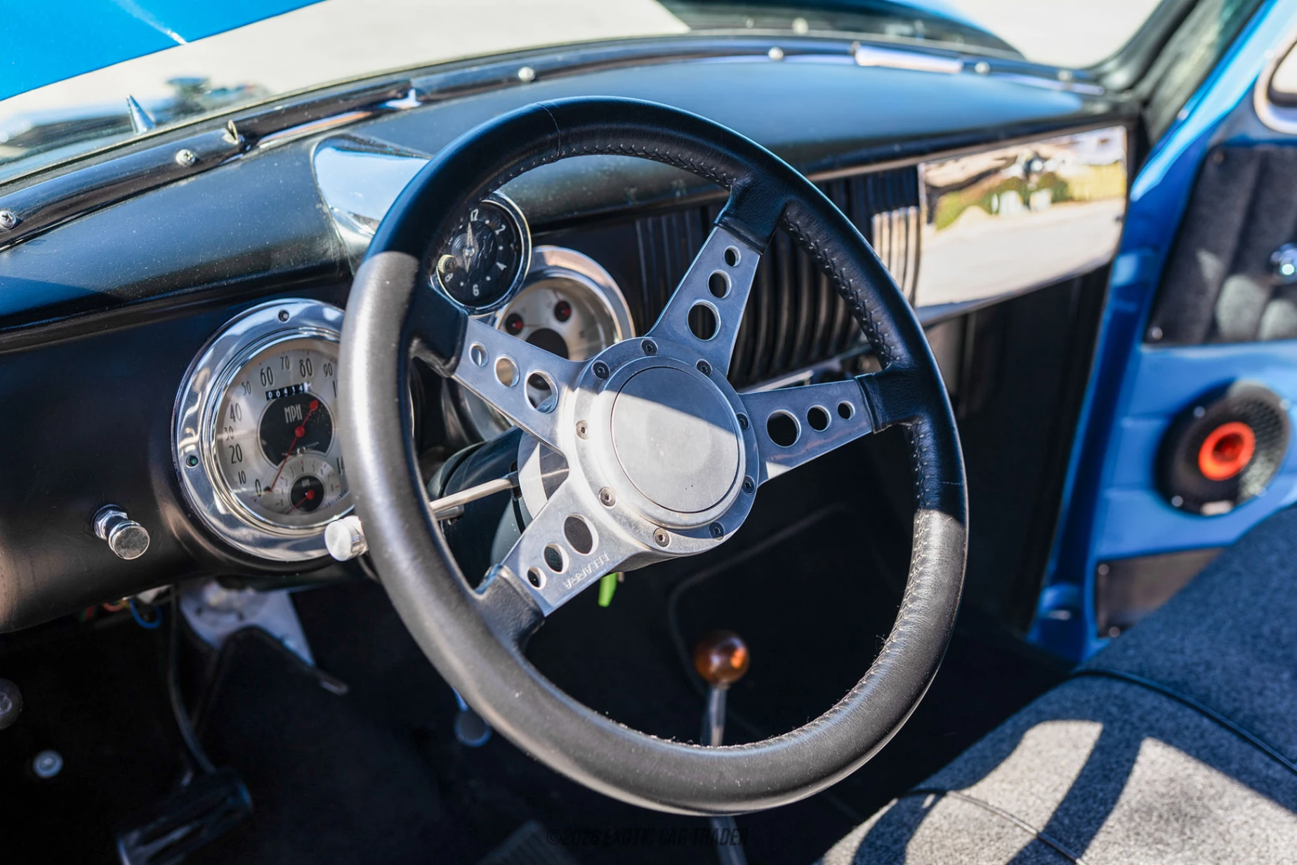 The exterior of this 1954 Chevrolet 3100 showcases the iconic styling that made these trucks a staple of American roads during the mid-20th century. The body has been repainted in a striking blue finish, highlighting the truck’s rounded fenders, classic grille design, and chrome accents. Chrome bumpers, polished wheels, and wide performance tires give the truck a clean hot rod stance, while the stained wooden bed floor adds a traditional custom truck touch that complements the overall presentation. Inside, the cabin features a gray reupholstered interior that blends classic simplicity with modern upgrades. The truck is equipped with a new steering column and an aftermarket steering wheel, providing improved driver control and a more contemporary feel. An updated gauge cluster and custom floor-mounted shifter add to the performance-oriented interior layout while still preserving the vintage character of the original dashboard design.