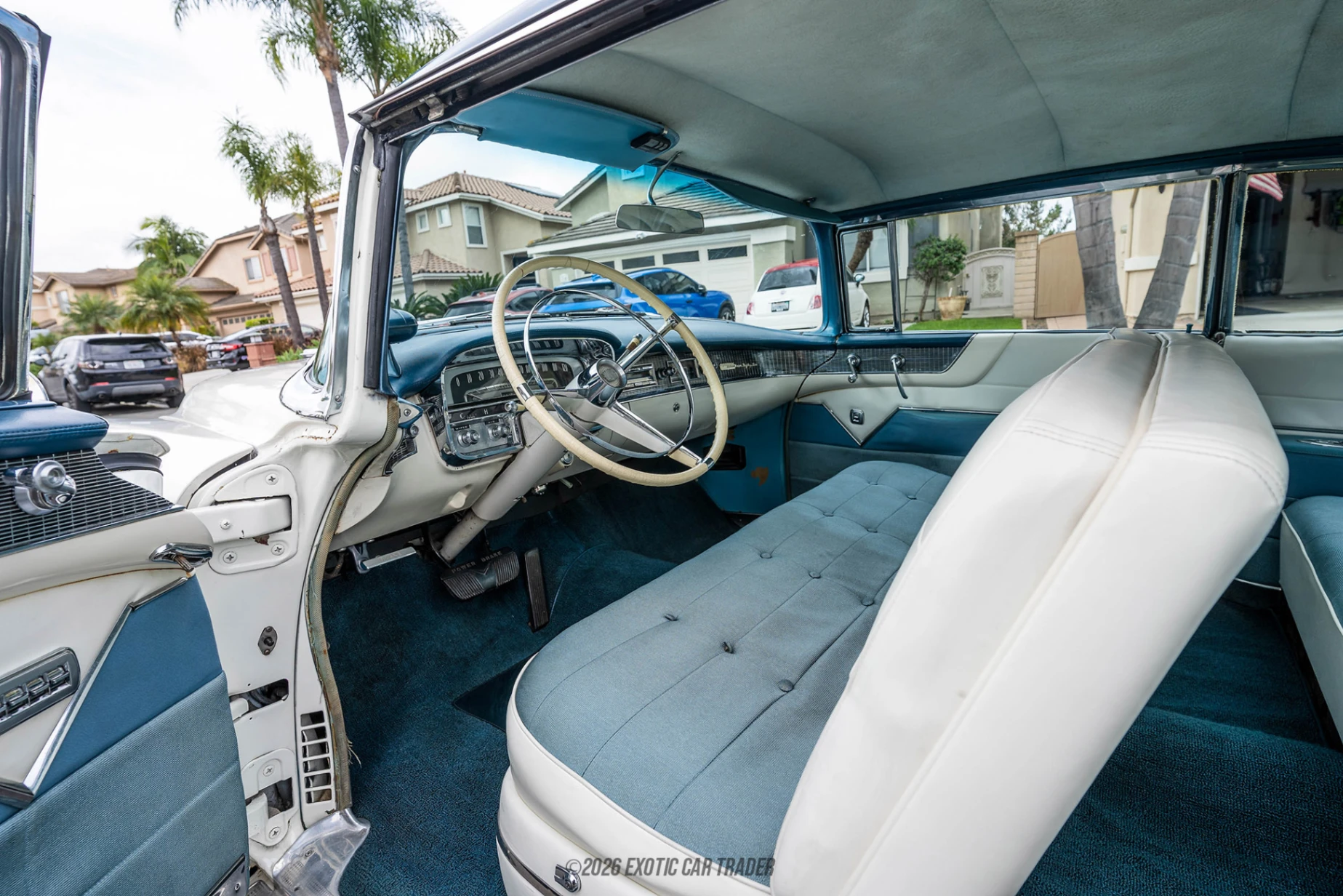 The exterior of this 1956 Cadillac Series 62 Coupe is finished in Olympic White, a clean and sophisticated color that highlights the car’s dramatic 1950s styling. Prominent chrome front and rear bumpers, along with extensive brightwork, give the car a commanding and luxurious appearance. The addition of a blue vinyl roof provides a stylish contrast while enhancing its period-correct aesthetic. From its wide stance to its subtle tailfin beginnings, this Cadillac reflects an era where design was as important as engineering. The interior of this 1956 Cadillac Series 62 Coupe is finished in blue and white, offering a vibrant and inviting cabin that perfectly complements the exterior. The seating is plush and designed for comfort, emphasizing Cadillac’s focus on luxury. Equipped with a heater and defroster, the cabin ensures usability across varying conditions. The layout is simple yet elegant, with classic instrumentation and materials that transport occupants back to a golden age of American motoring.