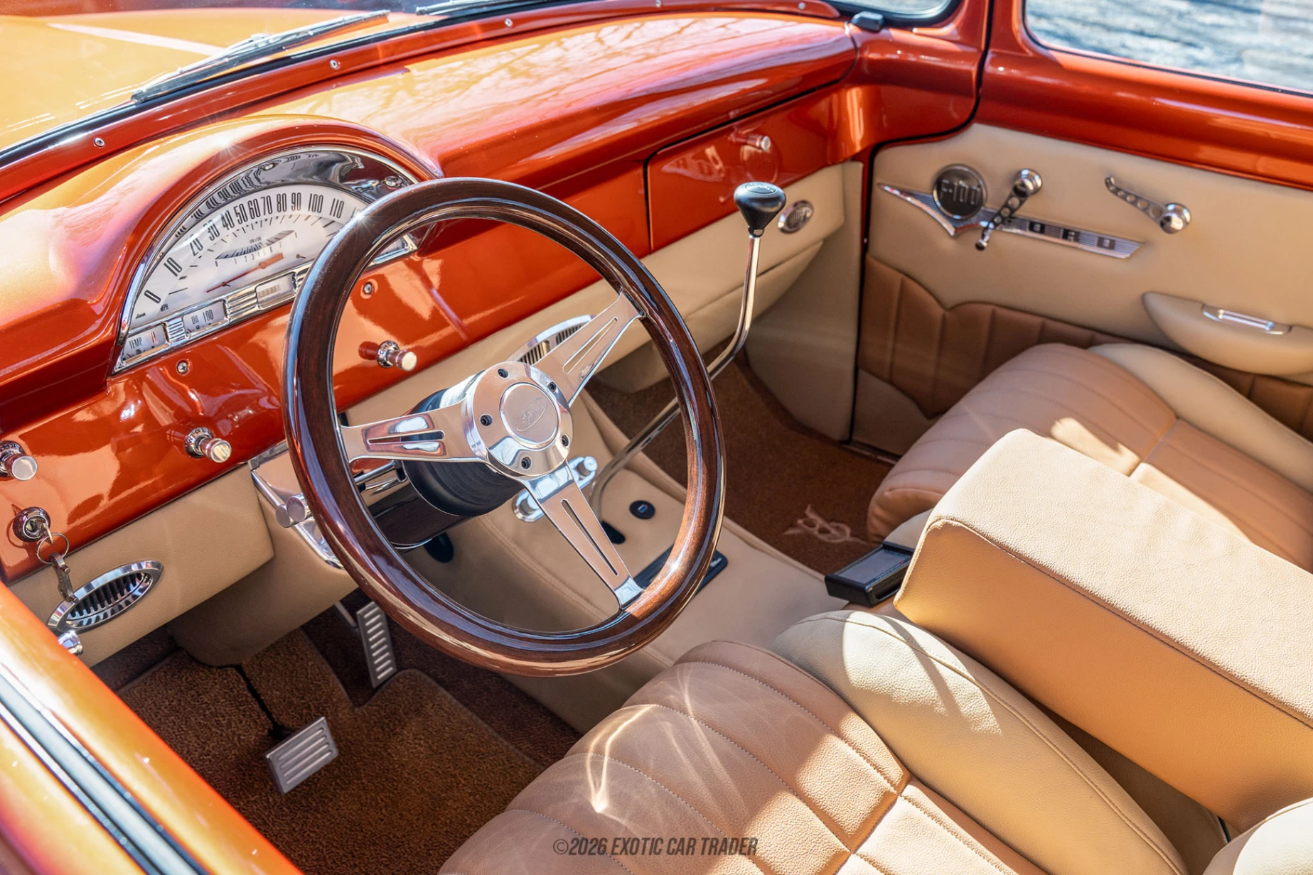 The exterior of the 1956 Ford F-100 Restomod showcases a beautiful Burnt Orange paint job that has been meticulously applied to ensure an excellent finish. The vehicle’s striking appearance is complemented by aftermarket wheels, enhancing its timeless aesthetic. Inside, the tan and brown interior has been thoughtfully reupholstered, offering a comfortable and inviting ambiance. The cabin features a calibrated speedometer for accurate readings and traditional truck styling that retains the charm of its era. Combined, the exterior and interior elements create a striking balance of classic style and modern comfort that is sure to impress anyone who steps inside or approaches this vehicle.