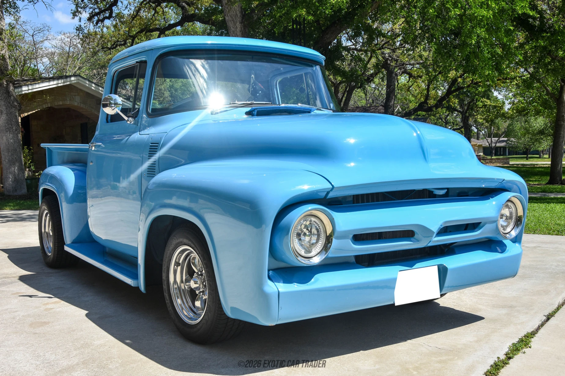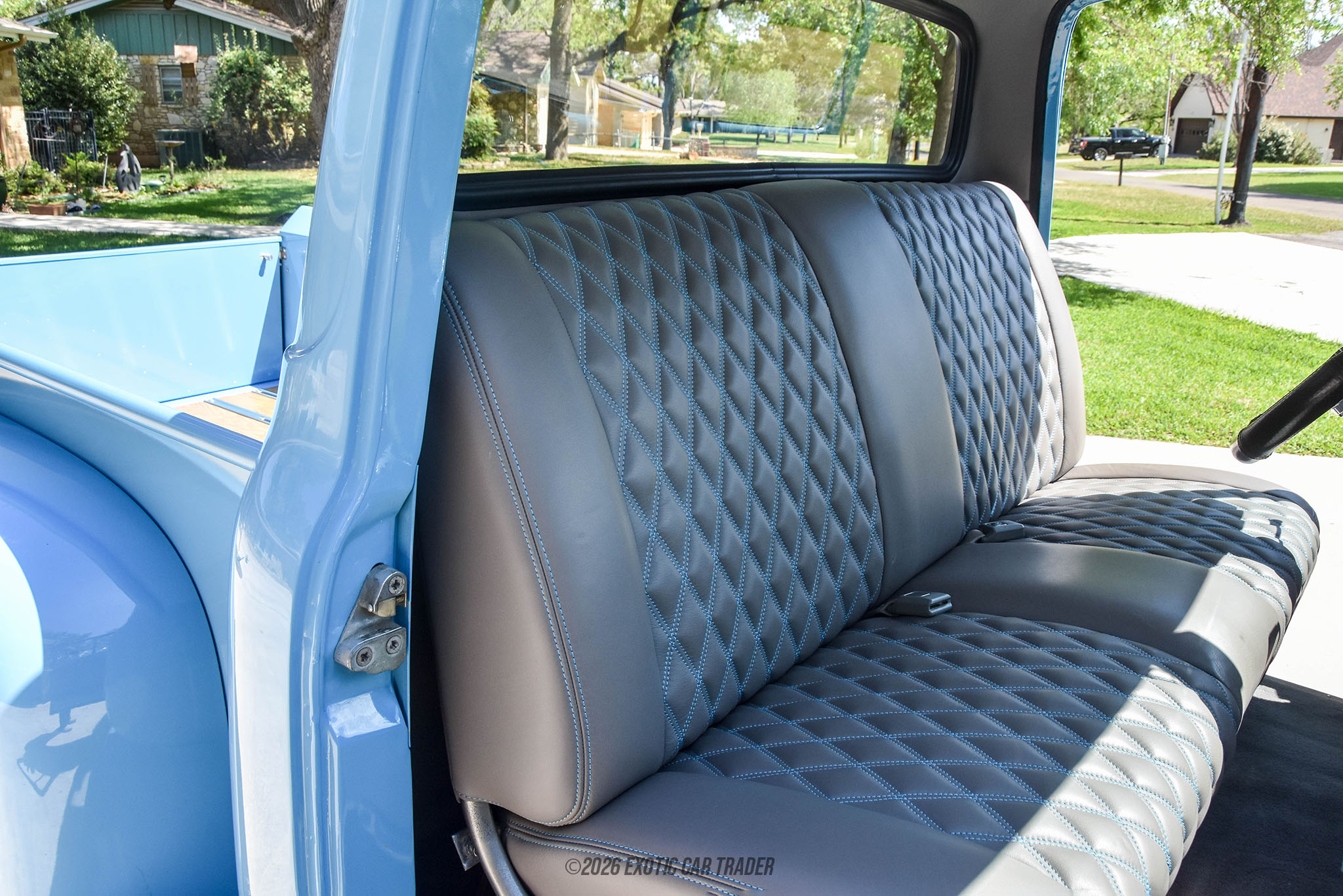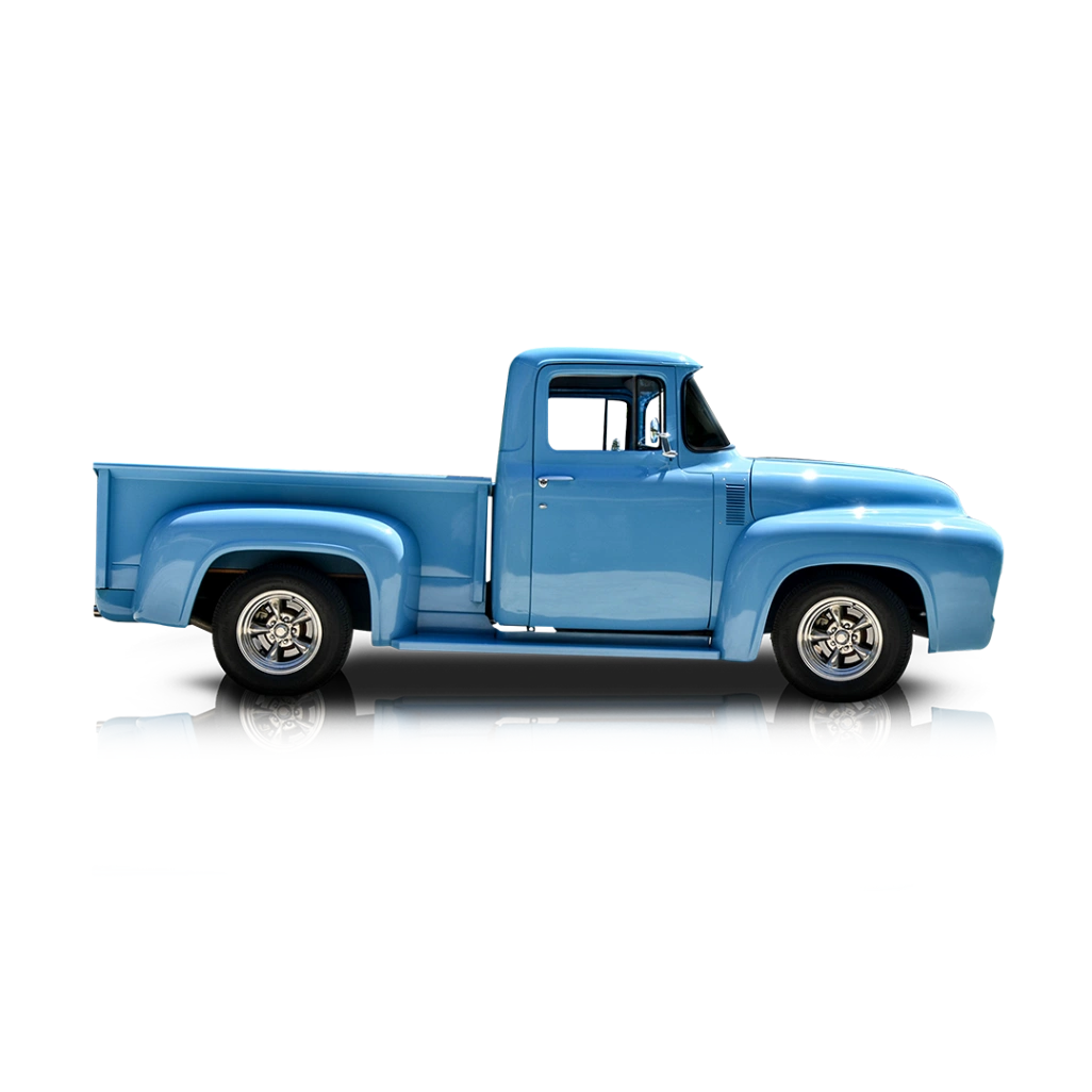 The exterior of this 1956 Ford F-100 Restomod is an eye-catching tribute to classic 1950s styling, now enhanced with modern touches. Its Baby Blue paint is custom and flawlessly finished, while the oak wood bed adds authentic vintage flair. Aftermarket wheels and a 4-wheel disc brake setup not only improve aesthetics but also enhance performance. The truck sits confidently with a 4” Posi rear end, signaling its upgraded handling and stability. The interior of this 1956 Ford F-100 Restomod is equally impressive. The cabin features a reupholstered diamond-stitched leather interior, accented with baby blue contrast stitching to match the exterior. Comfort and convenience are modernized with a premium aftermarket sound system, while the upgraded gray interior provides a clean, sophisticated look. Every detail has been thoughtfully considered, from the materials to the craftsmanship, making it as enjoyable inside as it is to admire outside.