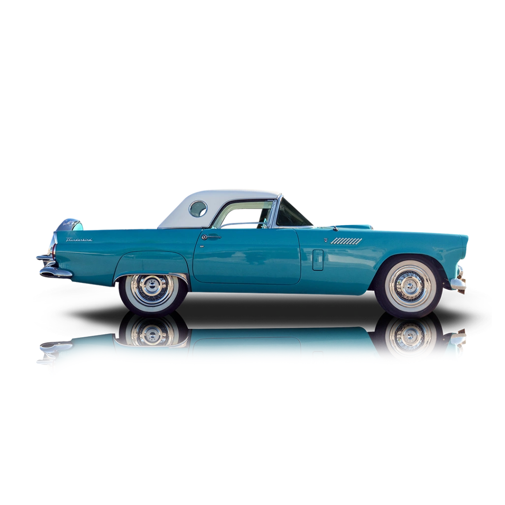 The exterior design of the 1956 Thunderbird showcases smooth body lines, chrome accents, and distinctive styling elements that defined 1950s American cars. Its wide chrome grille, bumper guards with integrated fog lamps, and sculpted front fenders give the car a bold yet refined presence. The removable Colonial White hardtop with signature porthole windows adds one of the Thunderbird’s most recognizable visual cues, while wire-style wheel covers and wide whitewall tires complete the classic period-correct look. Finished in Peacock Blue, the car presents a vibrant appearance that highlights the Thunderbird’s elegant proportions. Inside, the cabin features a turquoise and white interior that complements the exterior color scheme. The interior reflects the Thunderbird’s focus on personal luxury with comfortable seating, chrome trim accents, and a driver-focused dashboard layout. A floor-mounted automatic shifter adds a sporty touch, while classic gauges and vintage controls maintain the car’s authentic mid-century feel. The combination of color, materials, and simple yet stylish design makes the Thunderbird’s interior both inviting and timeless.