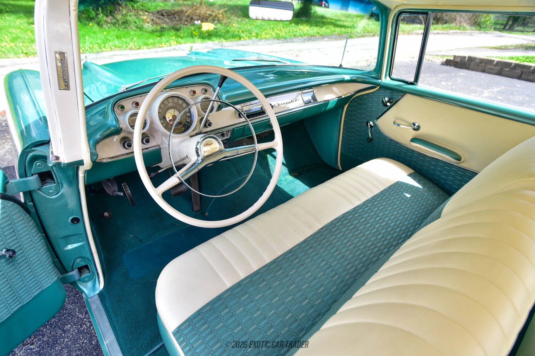 This example features a striking custom two-tone green and cream paint job that elevates the already iconic Tri-Five design, highlighting its sweeping side trim, chrome accents, and classic proportions. The finish presents with strong visual appeal, complemented by brightwork and period-style wide whitewall tires that complete the look. Inside, the cabin has been reupholstered in a matching green and cream color scheme, maintaining the factory-inspired aesthetic while offering a refreshed and clean presentation. The bench seat, door panels, and interior surfaces show attention to detail, while the dashboard retains its classic layout and vintage charm, creating a cohesive and inviting interior environment.