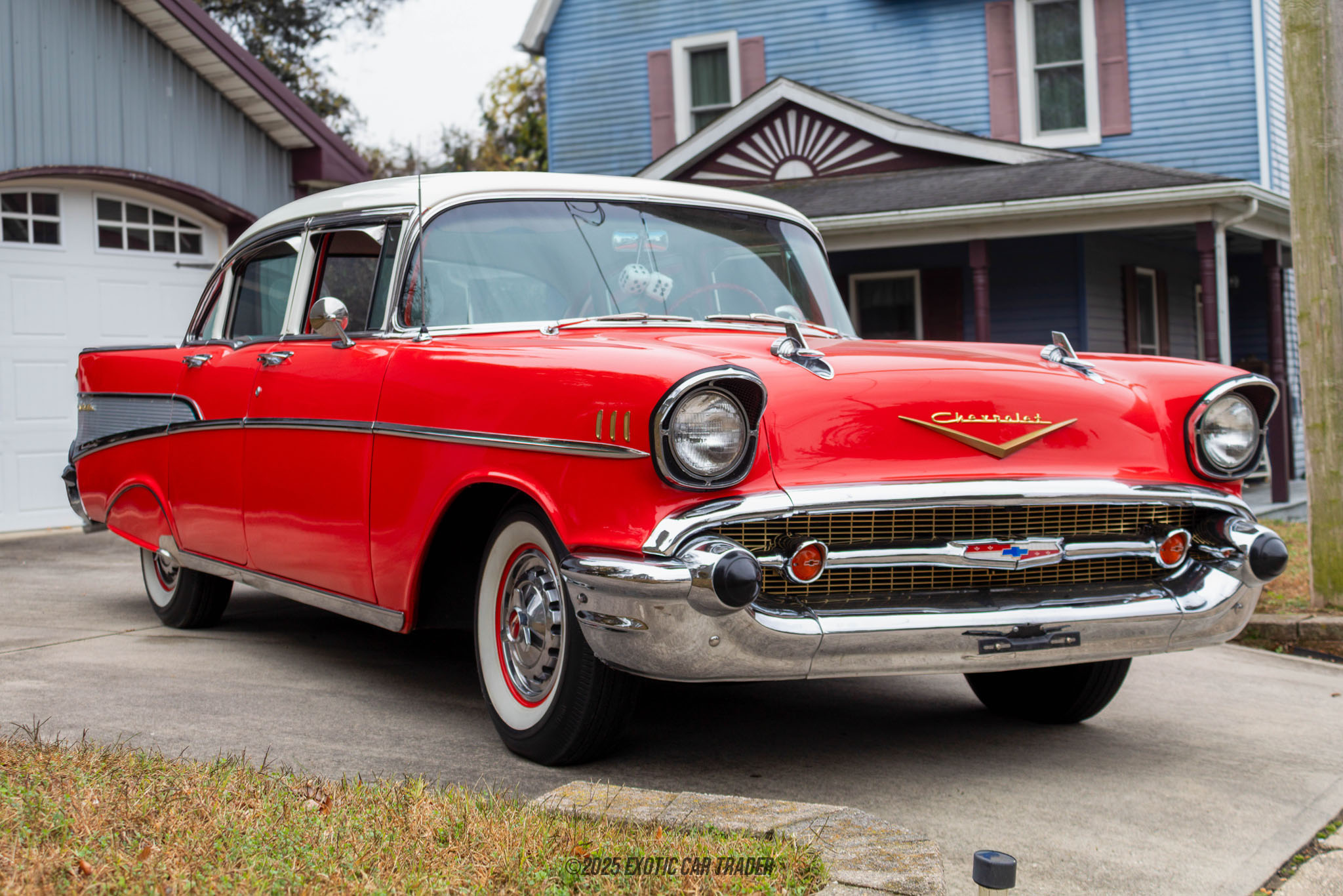 Making a statement is the norm with machines, from homegrown machines of the 50s; one glance is not enough, you'll need to allocate a significant portion of your day to navigate through all the curves and features present. This 1957 Chevrolet Bel Air 4-Door Sedan dons an orange exterior with an ivory-white vinyl roof, and it's the best color combo to complement that iconic Bel Air design. A walk around reveals an exterior complete with every component, including gold Bel Air trim to sweeten the deal. Complimenting all the chrome, which there is a lot of, and the trim is a set of period-correct wheels wrapped in white-wall tyres for added effect. It may take time, but once you are done glossing over all the exterior and its charm, you most definitely have to take a breather before you step into the 1957 Chevrolet Bel Air 4-Door Sedan. Once you are composed, the two-tone red and black interior cabin is nothing short of a 50s time capsule; every glance reveals originality, a set of Chevrolet carpets welcomes you in, a radio plays your tunes, and air conditioning cools you down on a hot summer day drive.