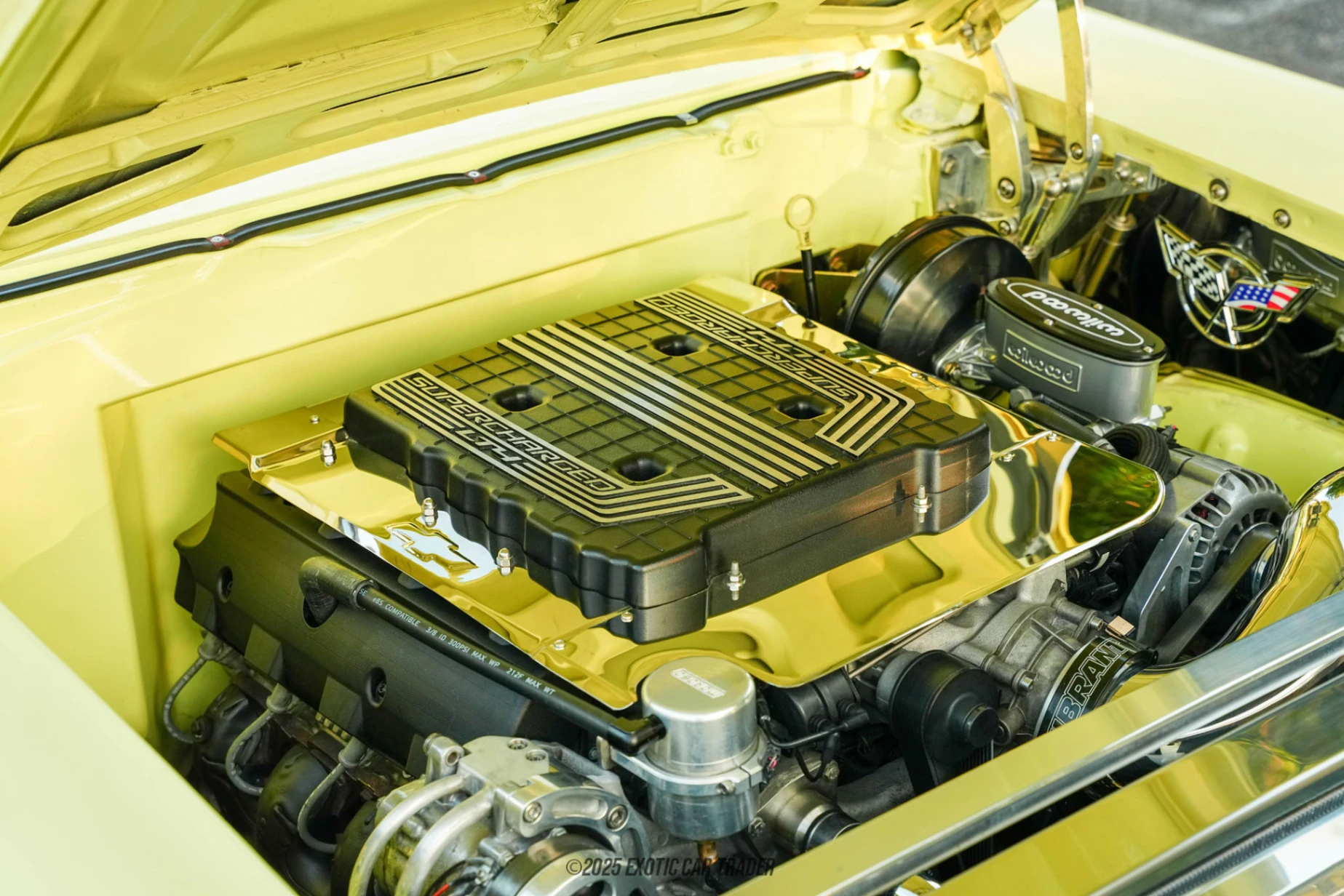 This 1957 Chevrolet Bel Air Restomod is a two-door coupe variant and has now been painted in a bright shade of yellow. The color is very representative of late Fifties and Sixties cars, as bright colors were a favorite in those days. This car sits on air shock absorbers and features a nice set of US Mags aluminum wheels in 18-inch size. These wheels are 12-inches wide at the rear and 10 inches wide at the front, which is a good thing since the supercharged V8 up front can easily leave long, dark rubber marks on the tarmac. You’ve also got signal lights beneath the doors for added safety. The brown and tan two-tone interior is a custom leather-upholstered job. It’s also accentuated by a custom full-length center console, making this car a luxurious four-seater. The seats are clearly aftermarket units, especially the power-adjustable front ones. There’s a digital dashboard, air conditioning, a custom touchscreen-controlled sound system and even a reverse camera. Basically, this car contains all the niceties you’d want for daily driving in 2025.