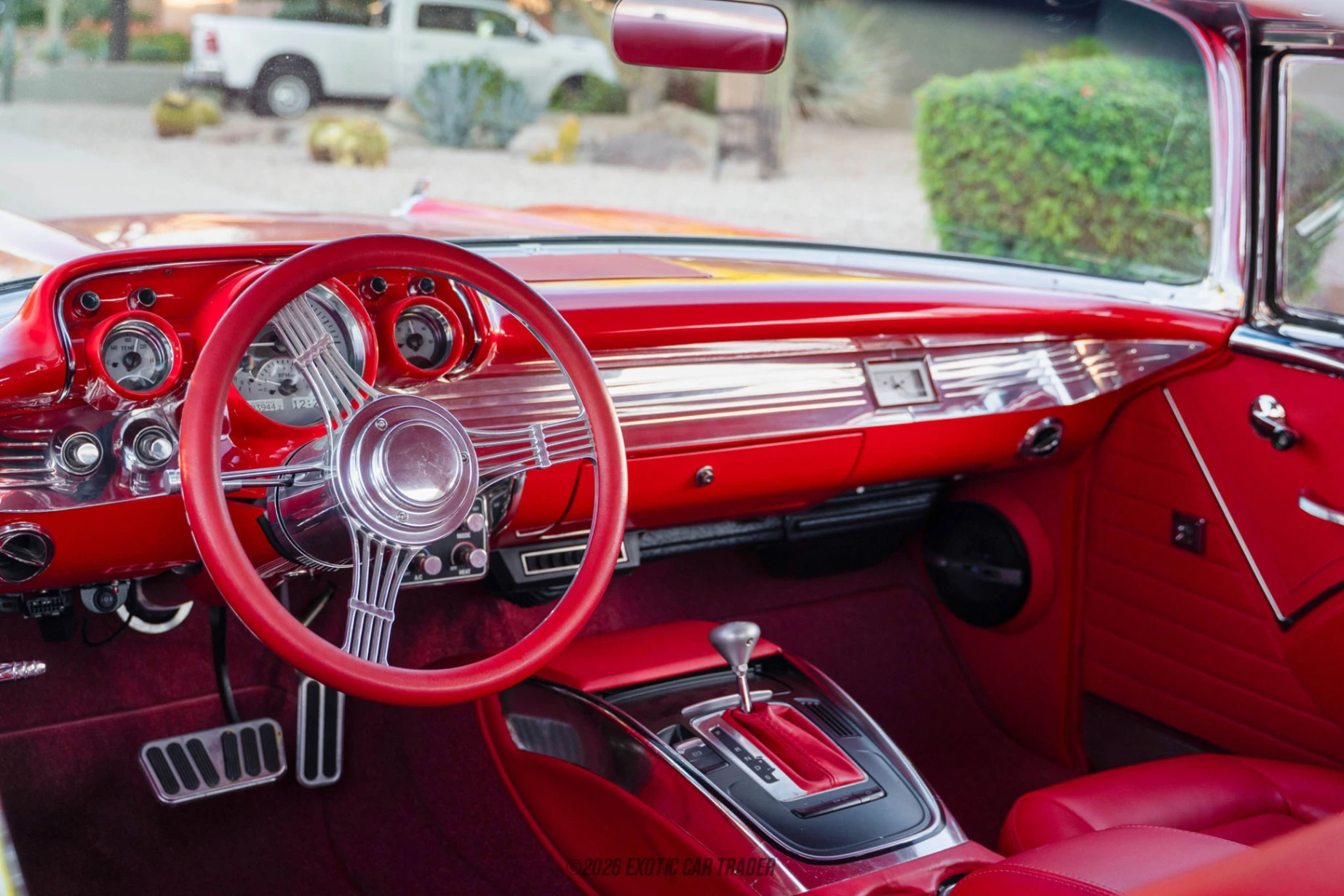 This 1957 Chevrolet Bel Air Sport Coupe Restomod is underpinned by that Art Morrison GT-5 Performance chassis that we mentioned before, creating a safe and steady foundation for its lovely red body with silver Art Deco-style details, chrome bumpers and wrap-around windshield. Then, we get to its wheels which are Schott units that are 20 inches up front and 22 inches at the rear. As expected, they’re wrapped in low profile tires. The interior of this features custom leather reupholstering by Ceidella. You’ve got power windows, power seats and even a power radio antenna. Then, there’s Vintage Air heating and air conditioning for optimal all-weather, all-season comfort, a tilt steering column, an aftermarket steering wheel, upgraded gauges, new pedal covers, and a modern sound system. Rear-seat occupants even get air vents, which wasn’t a factory feature.