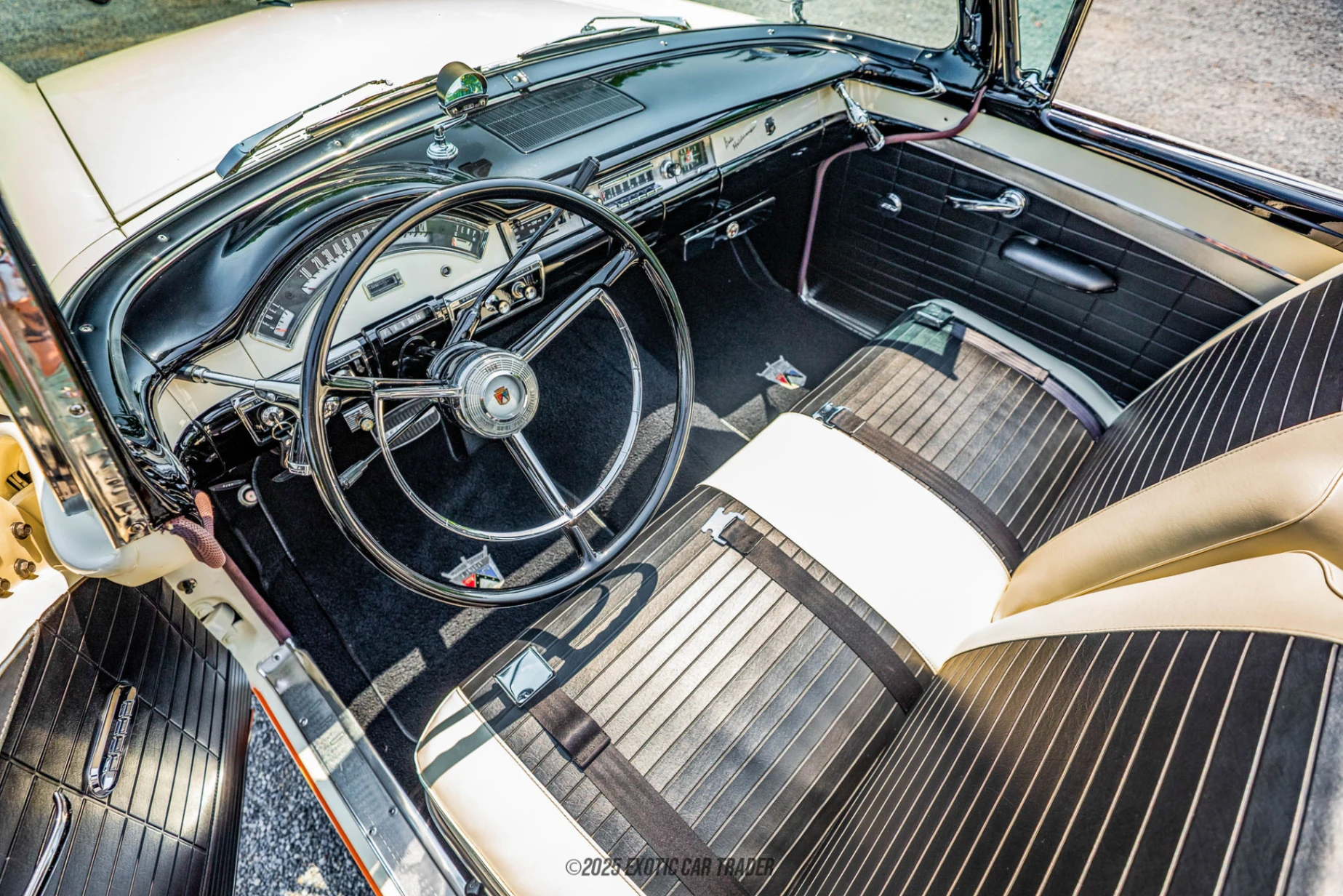 The two-tone Coral Sand and Colonial White paint scheme is quintessentially Fifties, capturing the optimistic, pastel-hued spirit of the era. Complementing its retro colorway are rear fender skirts, dual Searchlight Mirrors, and a Continental Kit that moves the spare tire outside the trunk—freeing up cargo space while enhancing vintage flair. A custom car cover is also included to help preserve the vehicle’s beauty when parked. Inside, the Sunliner offers a clean and classic cabin in black and white vinyl, with black carpeting completing the theme. The dashboard features Ford’s original Town & Country radio for authenticity, while a Bluetooth-capable modern audio system has been added to ensure compatibility with today’s media. Power windows round out the list of period-correct luxury features.
