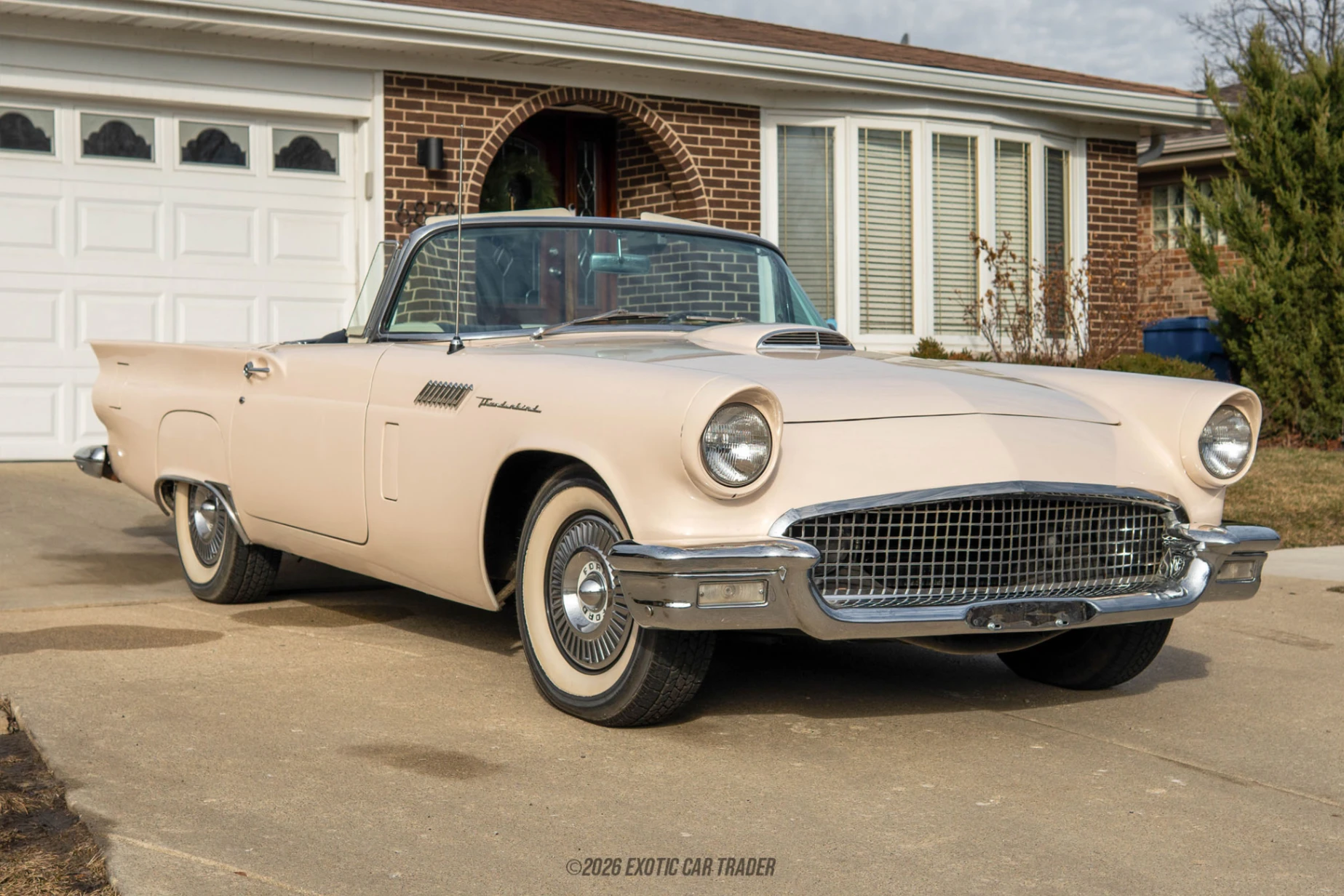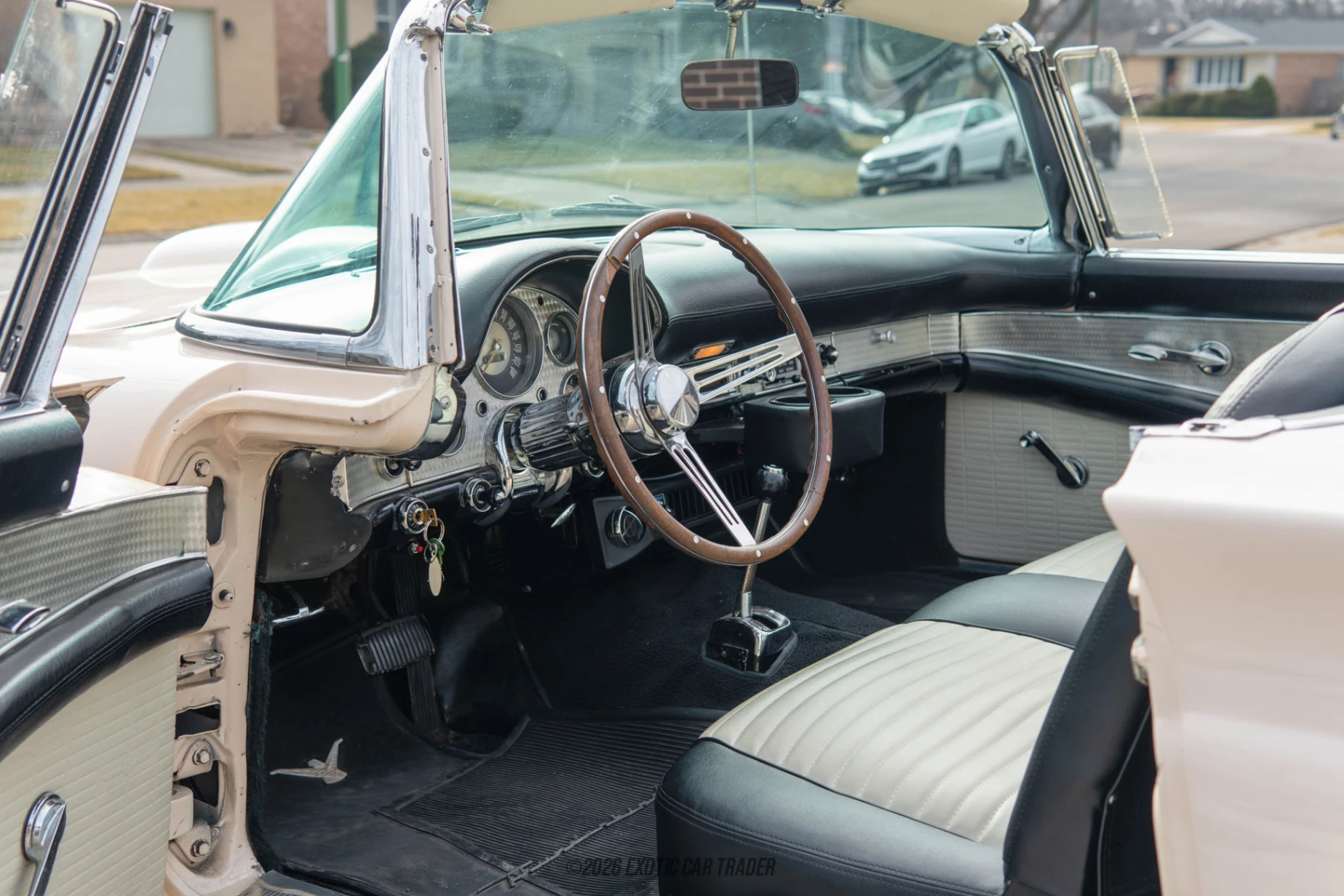 The Cream exterior highlights the Thunderbird’s elegant lines, accented by fender skirts and wide whitewall tires wrapped around factory-style Thunderbird hubcaps for a period-correct stance. The body-colored hardtop with signature porthole windows adds to its unmistakable 1950s character. Inside, the reupholstered black and white cabin maintains its classic dual-tone aesthetic while incorporating subtle upgrades such as a vintage-style Bluetooth radio and an aftermarket steering wheel. Comfort is enhanced by power steering, power brakes, heater and defroster, seat belts, and an added Vintage Air air-conditioning system, offering improved usability without sacrificing classic appeal.
