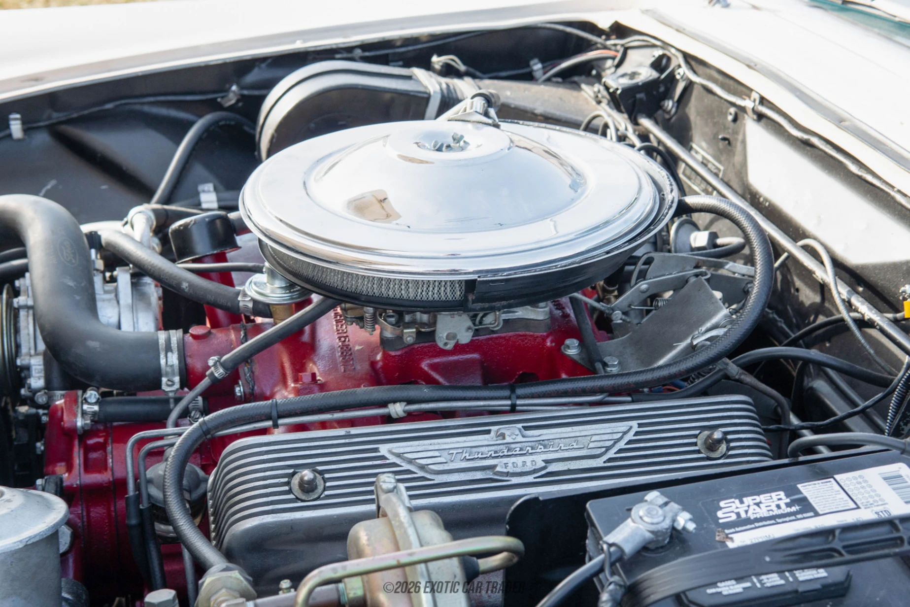 At the heart of this 1957 Thunderbird is the powerful 312 cubic inch V8 engine, paired with a Holley 4-barrel carburetor, ensuring robust performance. The three-speed Ford-O-Matic transmission ensures smooth shifting and responsive handling, making this Thunderbird not only a sight to behold but also a joy to drive. The rear-wheel-drive setup enhances its sporty characteristics, while features such as power steering and power brakes provide a refined driving experience. With amenities like rear air shocks and vendor skirts, this classic is as functional as it is stylish.