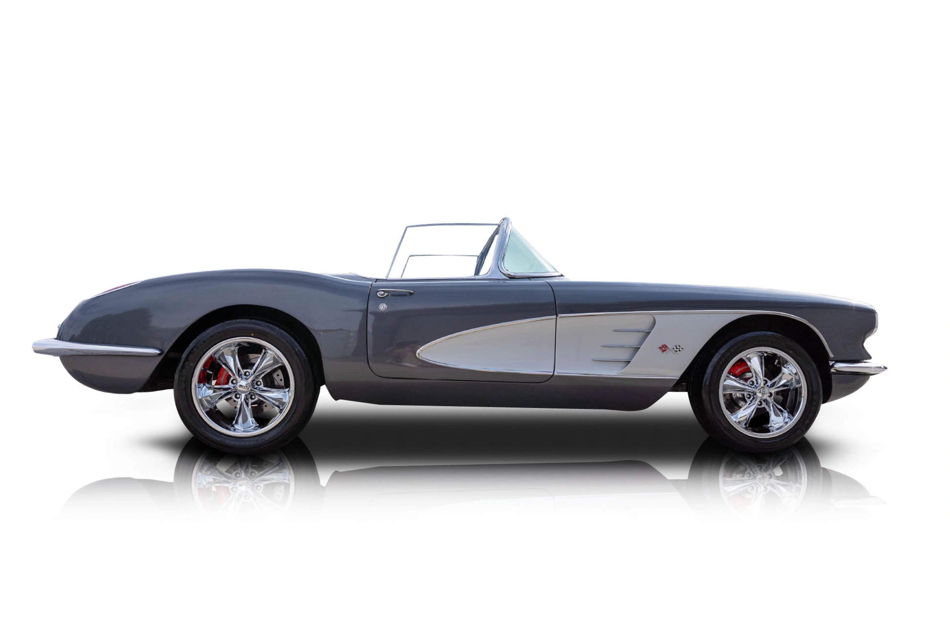 In addition to the 4-headlamp design, 1958 also brought more chrome and a new grille to the Corvette. There were also a couple of design features that were unique to 1958 only, such as the faux louvres on the hood and the chrome trunk spears. This car has been previously repainted in Charcoal and comes with both a body-colored convertible hard top and a black convertible soft top. It has 5-spoke chrome Foose wheels, red brake calipers and a 3-spoke aftermarket steering wheel (which blends in well with the car, contrary to most aftermarket steering wheels used on classic cars). Aside from the “8 ball” gear shifter knob, the blue interior looks mostly stock, and the leather bucket seats have matching seat belts. Overall, the visual upgrades done to this car are minimal, and quite subtle.