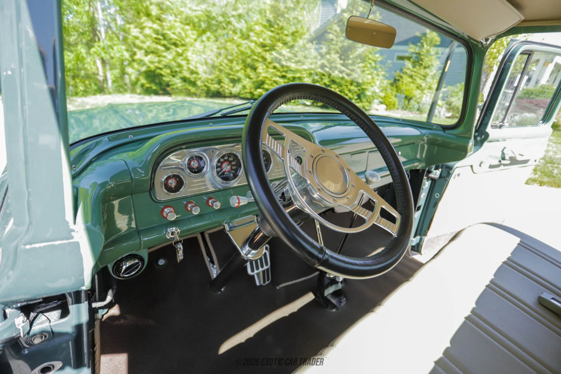 The exterior of this 1959 Ford F-100 features a custom green paint job that complements the truck’s signature late-1950s design, including its wide front grille, rounded fenders, and clean body lines. The stance is enhanced by a set of aftermarket American Racing wheels, giving it a subtle hot rod look without straying too far from its classic roots. Details such as the chrome accents and step-side styling cues maintain the truck’s vintage appeal, while the overall presentation reflects a thoughtful restoration with modern touches. The interior of this 1959 Ford F-100 has been refreshed in beige, creating a clean and inviting cabin. New seat upholstery and carpeting elevate comfort, while the addition of power windows and a Vintage Air system brings modern usability to this classic platform. The dashboard has been refinished and fitted with an aftermarket gauge cluster, providing improved visibility and functionality. A billet-style steering wheel adds a custom touch, tying together the interior’s blend of classic design and updated features.