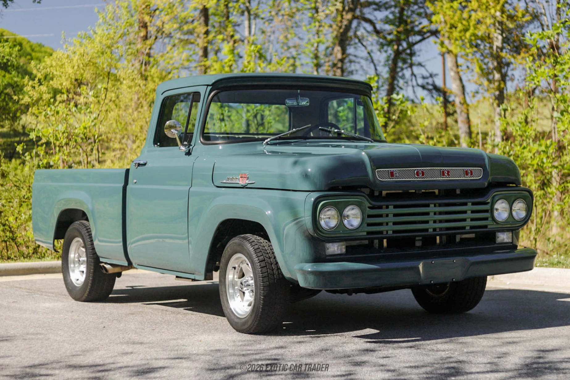 The 1959 Ford F-100 represents one of the most iconic eras of American pickup design, known for its bold styling and straightforward mechanical character. This example has been tastefully modernized into a clean restomod while preserving its vintage charm, making it far more enjoyable to drive in today’s conditions. Showing 8,371 miles, this truck blends classic looks with upgraded comfort and reliability. Finished in a custom green paint job over a refreshed beige interior, it offers a standout presence whether parked at a show or cruising on the road. With a Windsor V8 swap, updated wiring, and modern conveniences like air conditioning and power windows, this F-100 is built to be driven and enjoyed.
