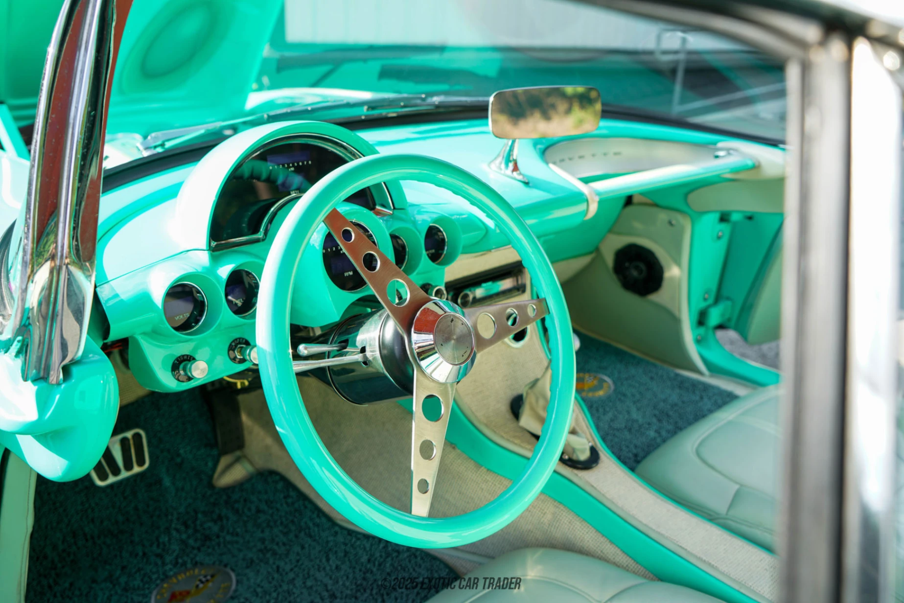 This 1960 Chevrolet Corvette LS3 Restomod’s first defining feature has got to be its large alloy wheels with low-profile tires, as they definitely weren’t even thought of when the C1 debuted way back in the Fifties. Then, the car’s upgraded brake calipers in red stare back at you. Finally, your eyes meet the glorious custom paint job adorning the car’s graceful and curvaceous lines. The color is aptly called Teal, and it’s the perfect representation of what Fifties and Sixties cars wore back in the day. Upon entering the passenger cabin of this 1960 Chevrolet Corvette LS3 Restomod, you’ll be met by a white and teal two-tone interior, with color-changeable LED lighting for a modern vibe. Then, there’s air conditioning to keep you cool, while you sit upon replaced seats and grip the replaced steering wheel. The old gauges have been swapped out as well for a more accurate set of custom digital gauges. The gear shift knob is new too, and there’s an aftermarket audio system for your musical requirements.