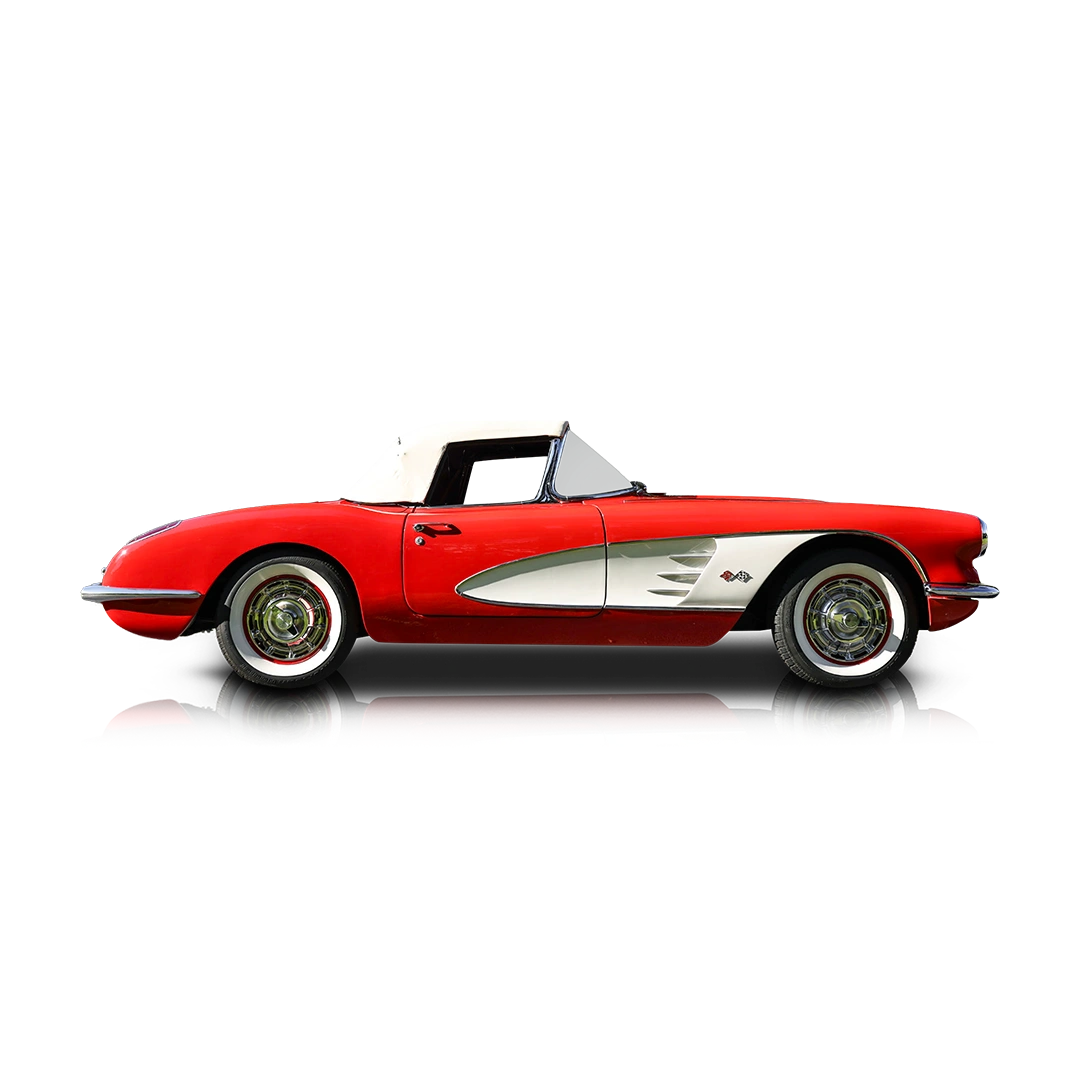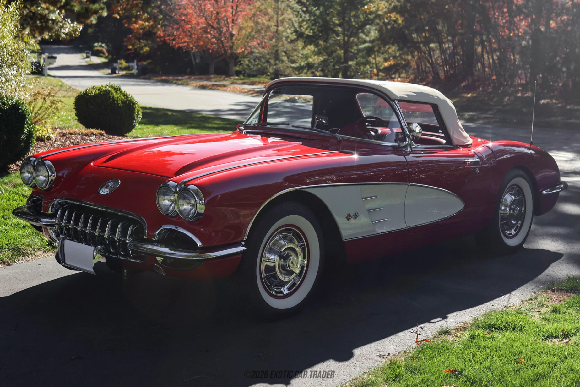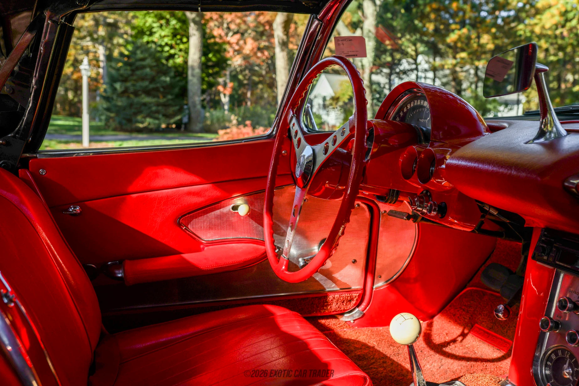 The exterior of this 1960 Chevrolet Corvette is finished in Roman Red with Ermine White coves, a signature two-tone combination that defines the C1 era. The sculpted body lines, chrome accents, and classic proportions give the car a timeless presence that stands out at any show or cruise. Details such as 15-inch steel wheels with Corvette spinner hubcaps and wide whitewall tires further enhance its period-correct aesthetic, while subtle upgrades like improved braking components add modern functionality without compromising its vintage appeal. The interior of this 1960 Chevrolet Corvette is finished in red vinyl, maintaining an authentic and cohesive look that complements the exterior color scheme. The cabin is simple and driver-focused, featuring classic gauges and straightforward controls that reflect the era’s design philosophy. A beige convertible soft top allows for open-air enjoyment, while the addition of an aftermarket sound system and Alpine head unit provides a touch of modern convenience. Overall, the interior balances originality with select upgrades for improved comfort and usability.