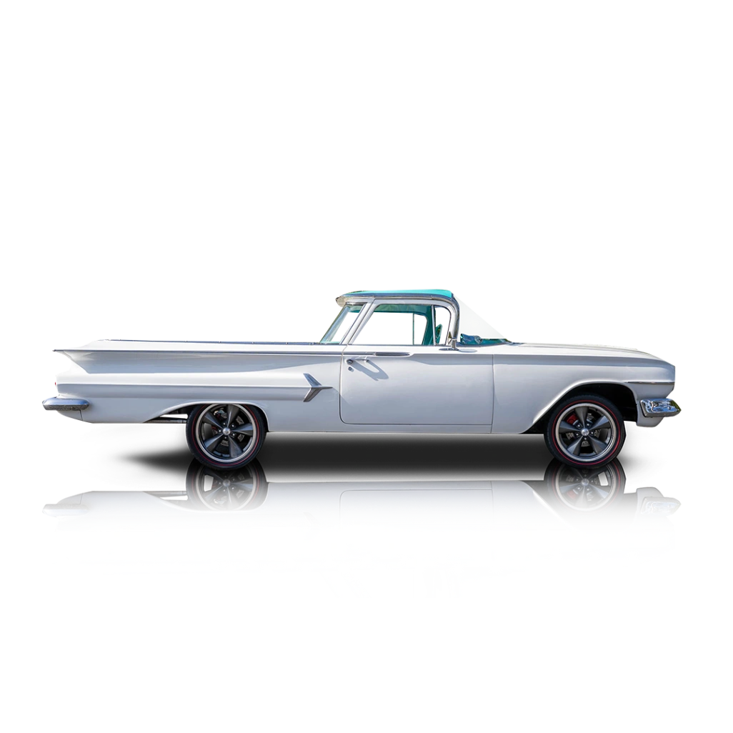Finished in clean white, this 1960 Chevrolet El Camino blends classic styling with thoughtful restomod updates. The long, low body lines and distinctive coupe-utility profile remain unmistakably original, while the 17-inch Boyd Coddington wheels add a subtle modern muscle stance without overwhelming the design. Out back, the wood-lined cargo bed enhances both visual appeal and functionality, reinforcing the El Camino’s dual-purpose character. Inside, the turquoise interior delivers a vibrant period-correct look, complemented by an aftermarket head unit with cassette stereo that adds usability while maintaining a vintage aesthetic. Vintage Air climate control further improves comfort, making the cabin far more enjoyable in modern driving conditions.