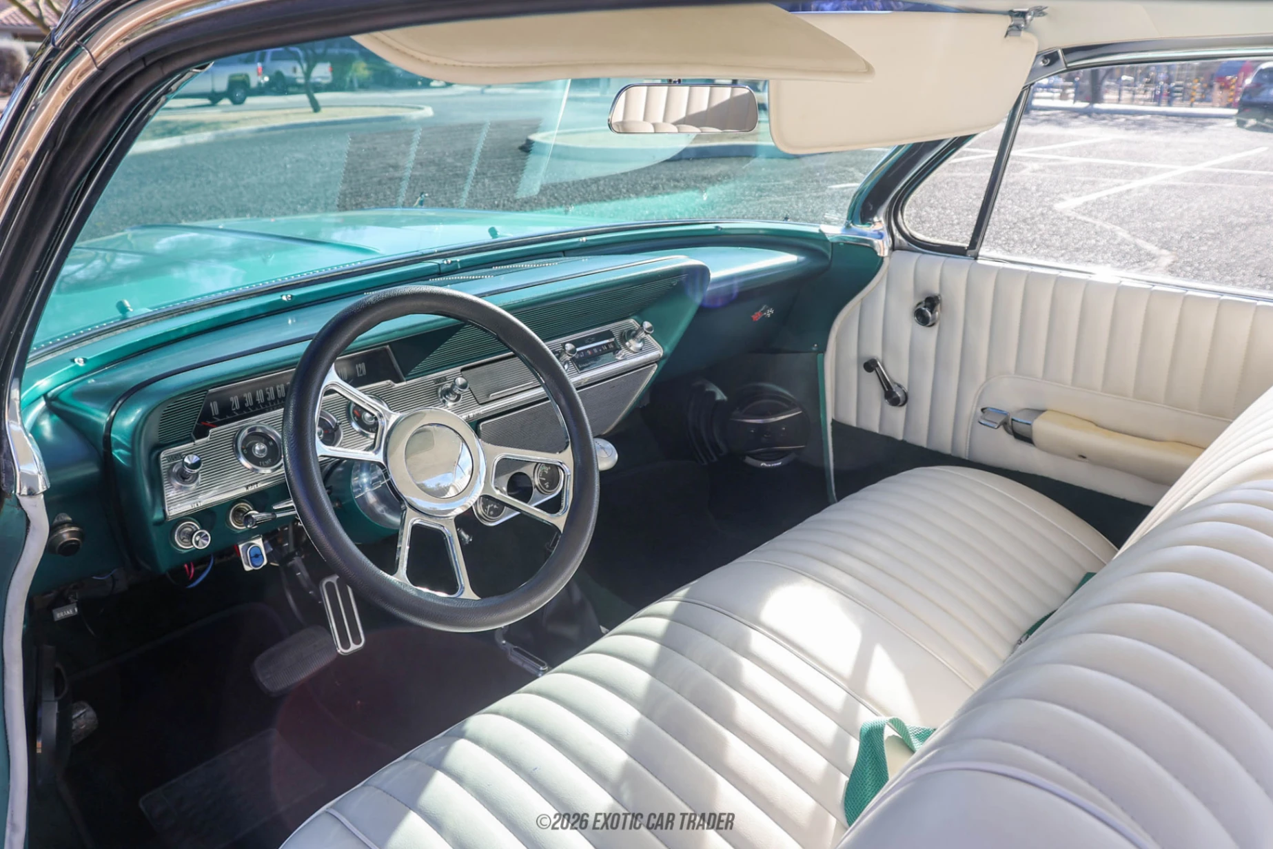 The exterior of this 1961 Chevrolet Impala is finished in green and rides on large 22-inch 5-spoke aftermarket wheels that dramatically modernize its stance. The chrome bumpers, quad headlight front fascia, and signature side insert trim remain intact, preserving the unmistakable early-60s Impala profile. While the body presents well from a distance, the paintwork is described as unfinished, and there is a noted quarter panel issue that will require attention. The candy apple red firewall under the hood adds a custom touch and contrasts sharply with the exterior color, signaling the car’s restomod direction. The interior of this 1961 Chevrolet Impala retains a largely factory-style appearance with white vinyl bench seating and a classic horizontal speedometer dashboard. The dash is painted to match the exterior theme, and the original-style steering wheel and trim remain in place, maintaining period-correct charm. Modern upgrades include Pioneer door-mounted speakers and a Pioneer 4-channel amplifier mounted in the trunk, supported by upgraded wiring. The combination of vintage aesthetics and updated audio components gives the cabin a usable, driver-oriented feel while still reflecting the car’s project status.The interior of this 1961 Chevrolet Impala Sport Coupe Restomod features white bench seats for front and rear occupants, a period dashboard and a sporty aftermarket steering wheel. We see some upgraded speakers and a Pioneer 4-channel amplifier resides in the trunk. Everything else looks more or less as it came from the factory, albeit still in great condition.