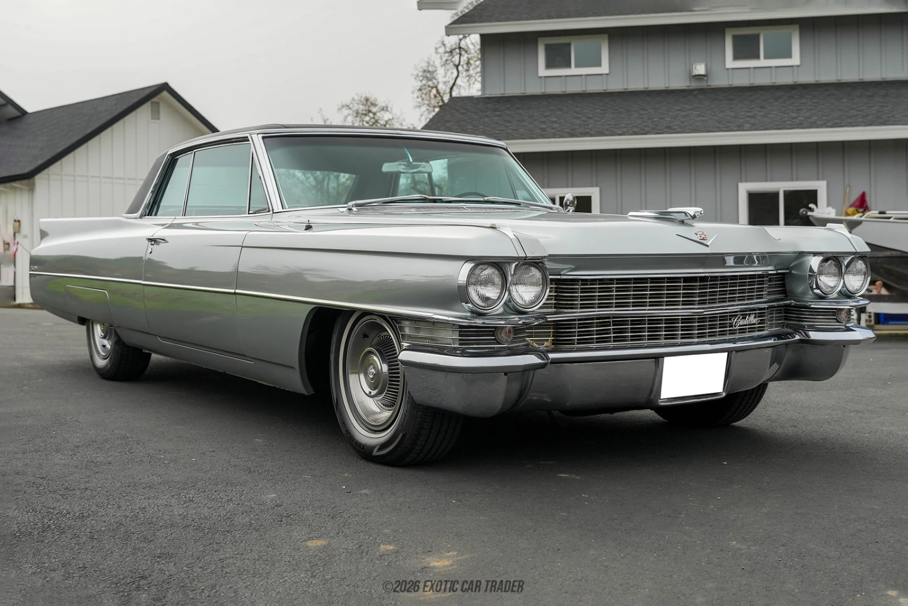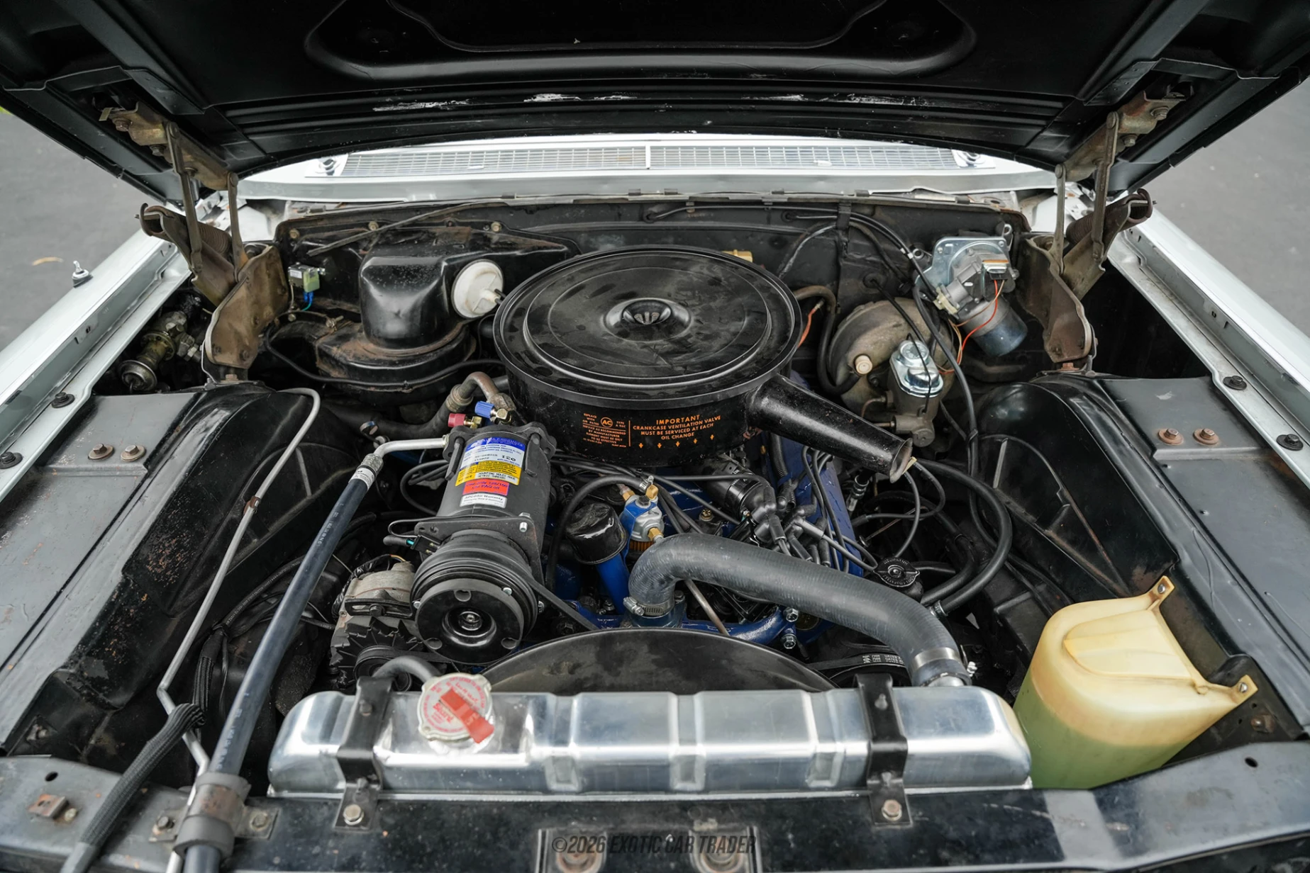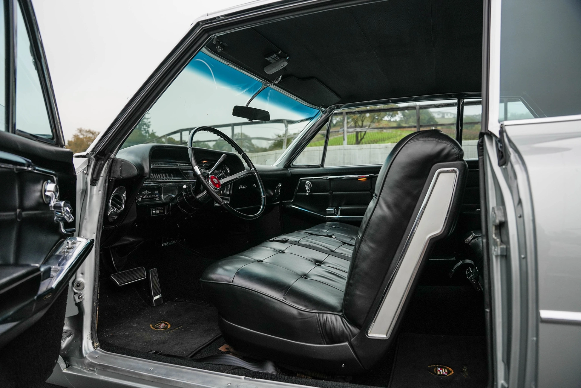 The exterior of this 1963 Cadillac Coupe DeVille is finished in Nevada Silver, a period-correct color that complements the car’s expansive body and chrome-heavy design language. The signature tailfins, wide stance, and polished chrome accents highlight Cadillac’s bold styling philosophy of the era. A vinyl top adds an extra layer of classic luxury, while whitewall tires complete the vintage aesthetic. The overall presentation maintains the car’s original elegance while benefiting from careful upkeep and subtle enhancements. The interior of this 1963 Cadillac Coupe DeVille has been reupholstered in black leather, offering a refreshed yet authentic cabin environment. Attention to detail is evident with a leather-wrapped dash cover, upgraded carpeting, and improved insulation throughout both the cabin and trunk, significantly enhancing ride comfort. Modern conveniences such as a Bluetooth-enabled audio system and added speakers provide contemporary functionality, while the inclusion of aftermarket seat belts improves safety. Despite these upgrades, the interior still captures the spacious, lounge-like feel Cadillac was known for.