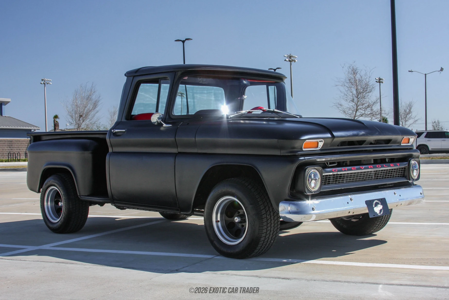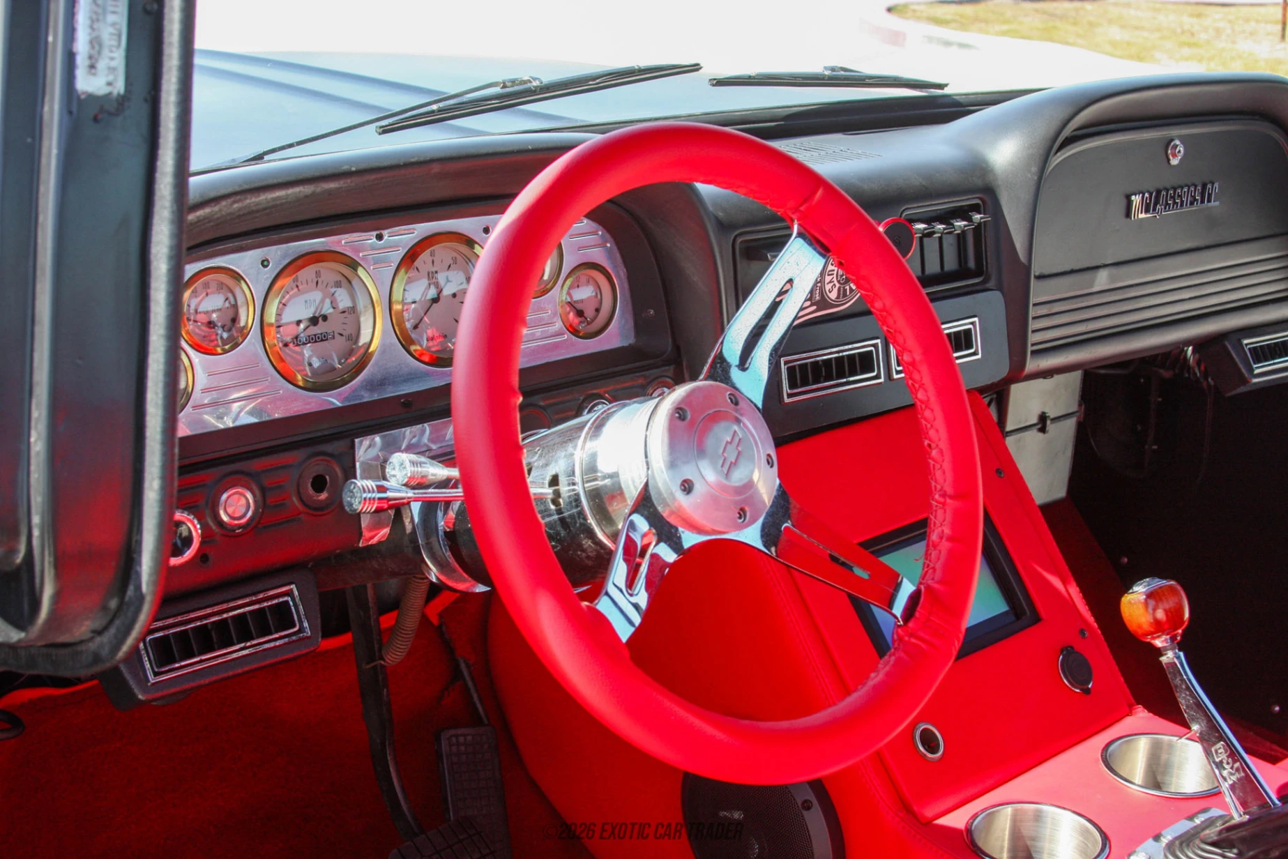 Repainted in a fine Satin Black coat, this 1963 Chevrolet C10 Restomod rides on a set of aftermarket 5-lug SS-style wheels that grant it a bit of cheeky sportiness. The first generation of C/K Series was anything but sporty, so this truck’s wheels, plus its aftermarket exhaust cutouts, custom paint job and V8 rumbling away make it something of a rambunctious one. It’s the kid with the cap slightly skewed sideways and a cheeky smirk beginning to form as an idea takes root, if you will. A peek into the cargo bed reveals a fine wood surface with metal strips, and it’s perfect for show – not for throwing loads of lumber in, for example. Treat it with respect. When you enter the red interior of this 1963 Chevrolet C10 Restomod, you’ll feel like you’re in a newer vehicle. That’s because you’ll find red leather seating, a Dolphin gauge cluster and an aftermarket steering wheel, for starters. Then, you look around a bit more and discover a Vintage Air heating and air conditioning system, a 12-volt power socket, an aftermarket touchscreen head unit and an upgraded sound system.