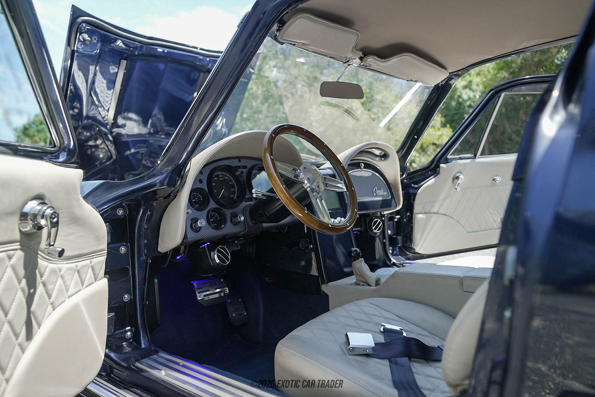 The exterior of this 1963 Chevrolet Corvette Split Window Coupe is finished in a deep Midnight Navy Blue, a custom Porsche-derived color that enhances the sculpted lines of the C2 body. The iconic split rear window design remains the centerpiece, while subtle modern touches elevate the overall look. Sitting on Schott custom wheels wrapped in Continental ExtremeContact tires, the car achieves a perfect blend of classic proportions and contemporary stance. Functional upgrades such as electric headlights, a custom fabricated firewall, and widened rear wheel tubs further highlight the level of detail in this build. The upgraded Z06-style braking system with red calipers is visible behind the wheels, adding both performance and visual contrast. The interior of this 1963 Chevrolet Corvette Split Window Coupe has been completely reupholstered in beige leather, delivering a refined and luxurious cabin experience. Custom bucket seats provide both comfort and support, while the dashboard integrates modern gauges within a classic-inspired layout. An Ididit steering column and custom wiring harness ensure reliability and improved functionality, while a hidden audio system maintains a clean, uncluttered appearance. Additional modern conveniences such as power windows, a power hood, and a Vintage Air climate control system make this classic Corvette feel far more contemporary without sacrificing its original charm.